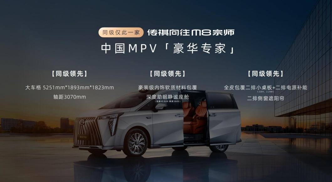 传祺向往M8宗师,是全家长途出行的“舒适专家”,日常城市通勤的“智能专家”,周末家庭聚会的“插混专家”,商务接待出行的“豪华专家”,更是守护全家出行的“安全专家”。