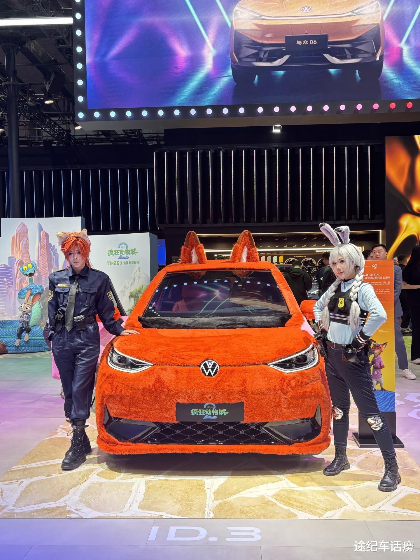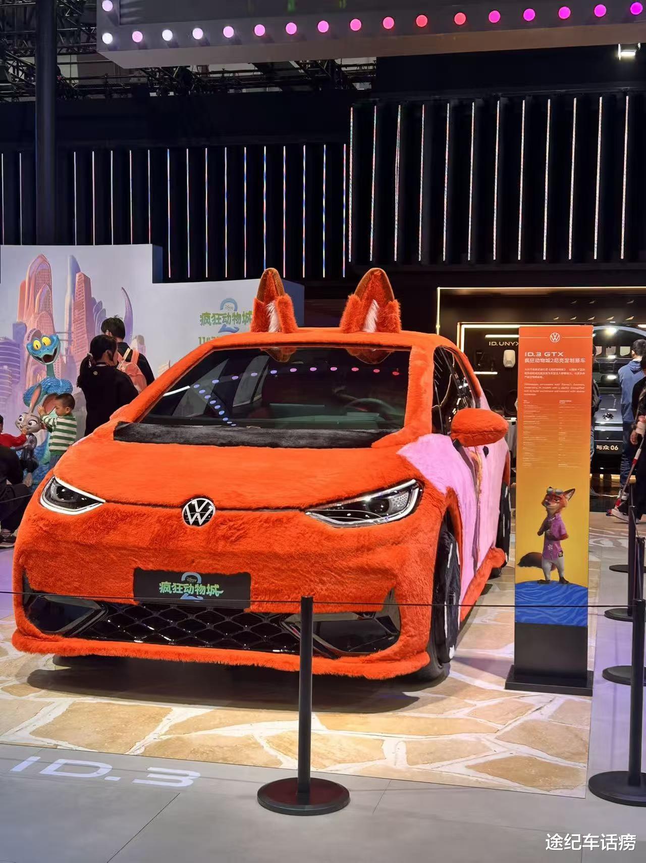 先奔联名车区,我愣是在尼克款 ID.3 GTX 旁边站了十分钟。那橙颜色太正了,像刚从动画里捞出来晒了晒太阳,车顶的狐狸耳朵软乎乎的(偷偷摸了下,是硬壳但手感特好),旁边有个小丫头拽着妈妈的手,踮着脚喊:“我要跟小狐狸车拍照!” 更惊喜的是开后备厢的时候,里面贴满了尼克的小贴纸,还有动物城地图的防滑垫,跟拆盲盒似的,连我这个 “老阿姨” 都觉得心痒痒。