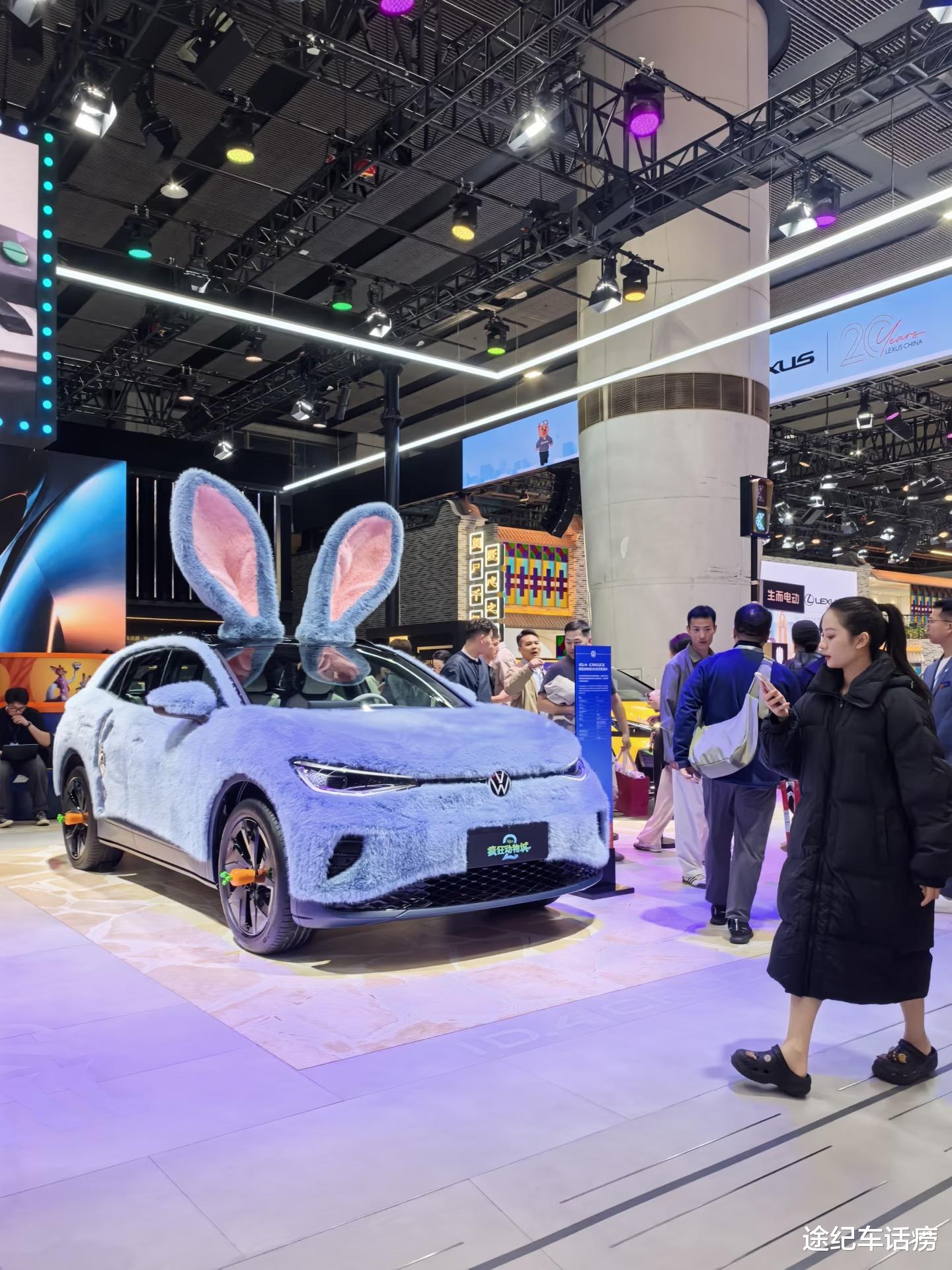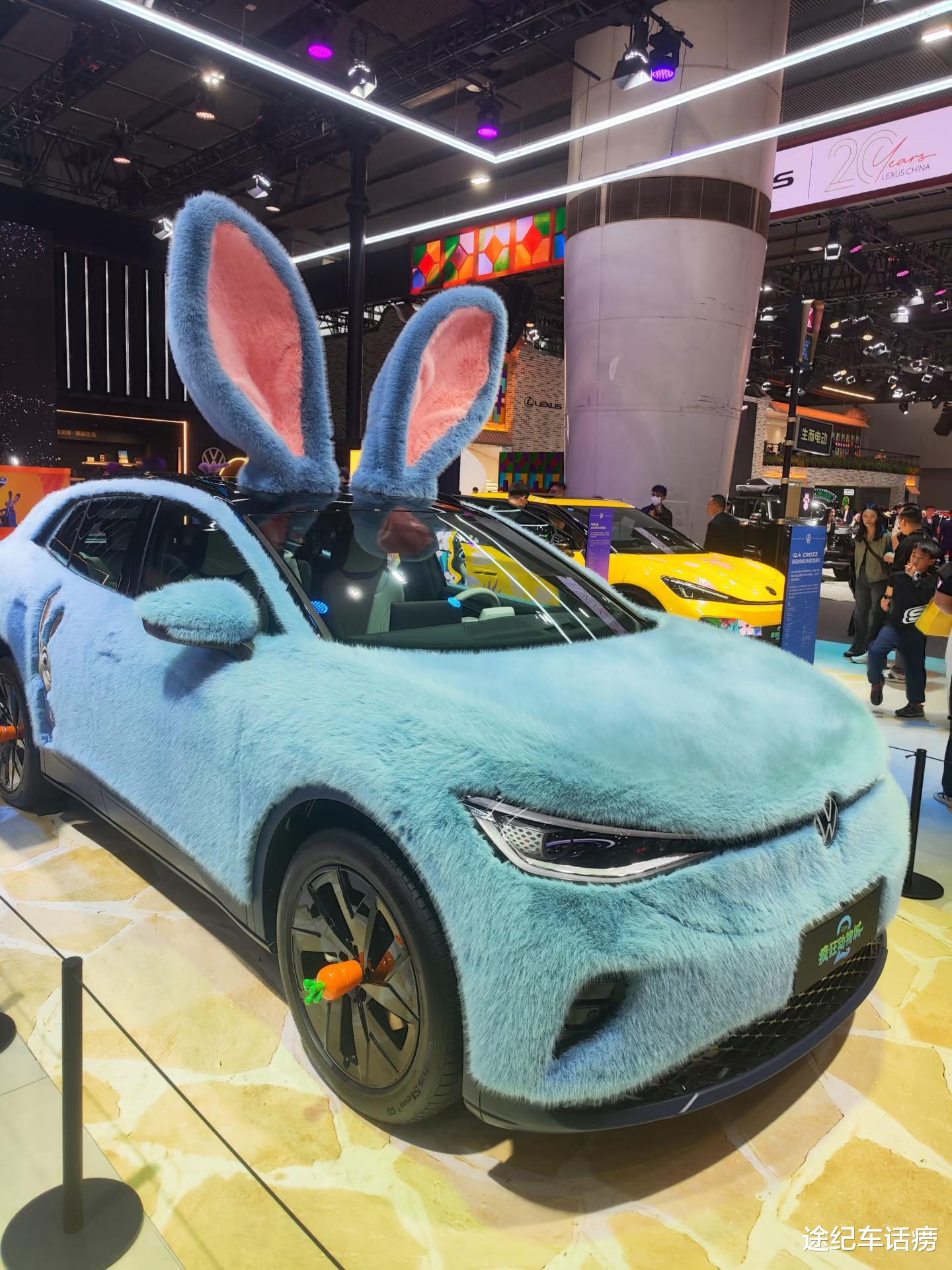 旁边朱迪款 ID.4 CROZZ 更戳萌点,浅粉色车身嫩得不行,轮毂居然是胡萝卜造型,转起来的时候像小兔子在蹦跶。车门上的兔子剪影特别有意思,光线亮的时候是浅白,暗一点就变成粉紫,坐进车里更绝:头枕上绣着朱迪的小警徽,脚垫是草地纹路,连中控屏开机都是朱迪的 “加油” 动画,我坐进去差点忘了自己是来逛车展的,还以为要去动物城警局打卡。