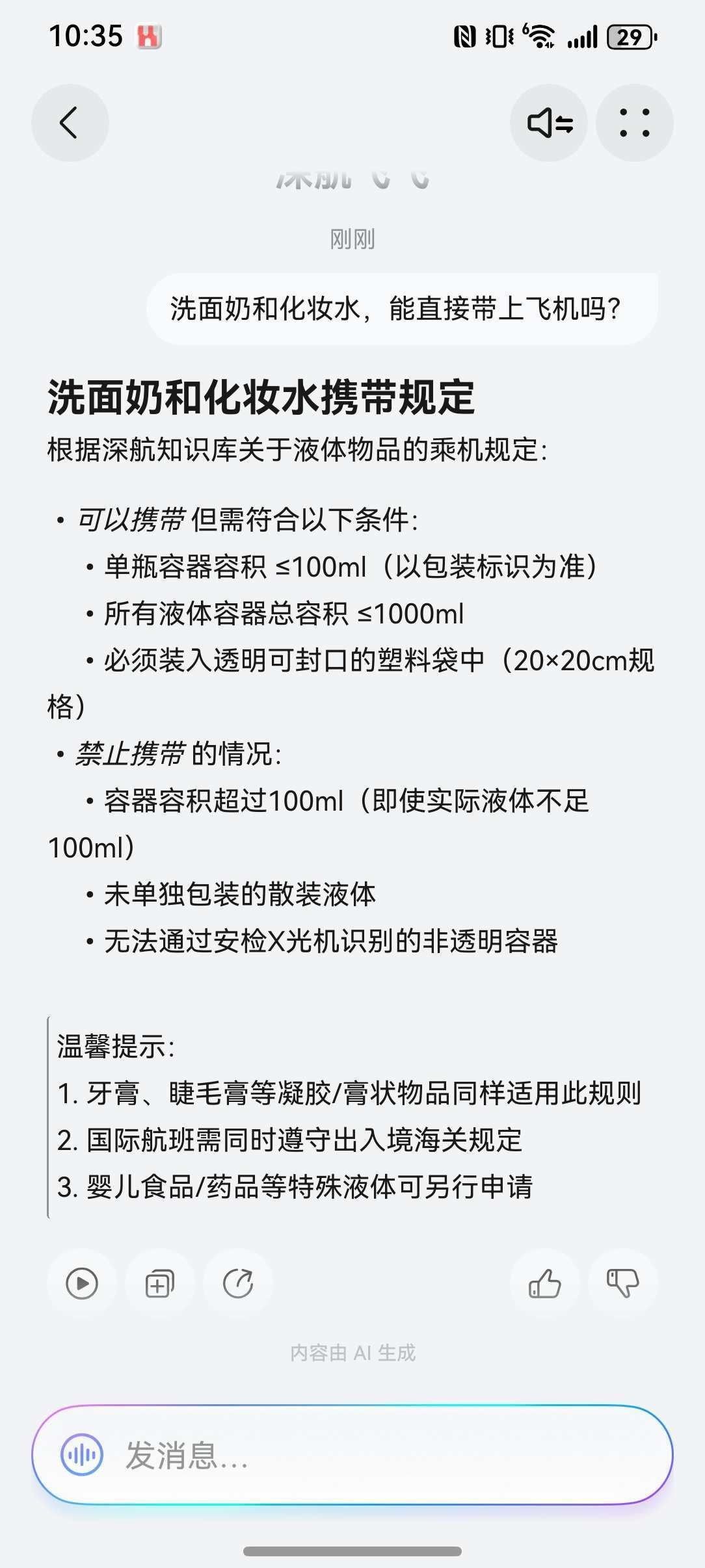 我直接输入了困扰的问题:“洗面奶和化妆水,能直接带上飞机吗?”深航飞飞Agent的回复堪称“打包指南”。TA清晰列出了所有规定,还给出了温馨提示。