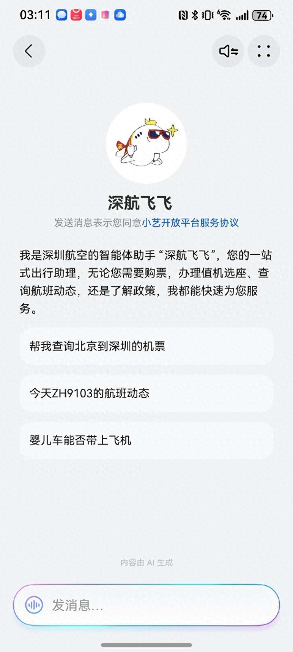 这次出发前,我照例对着洗漱包发愁,突然想起升级到鸿蒙5的华为Pura 80——在小艺App-发现-智能体市场里有个“深航飞飞”Agent或许能帮上忙。