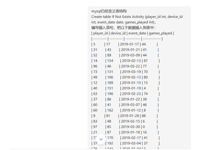 public void Case550(){ var mdfile = @"D:\xxx\LeetCodeCase\case550\case6.md"; var sqlfile = @"D:\xxx\LeetCodeCase\case550\case6.sql"; var mdTxtArr = File.ReadAllLines(mdfile); var sqlBuilder = new StringBuilder(); sqlBuilder.AppendLine("INSERT INTO Activity (player_id, device_id, event_date, games_played) VALUES"); foreach (var item in mdTxtArr) { var arr = item.Trim('|').Split('|'); if (arr.Length >= 4) { var val = $"({arr[0].Trim()}, {arr[1].Trim()}, '{arr[2].Trim()}', {arr[3].Trim()}),"; sqlBuilder.AppendLine(val); } } var sqlTxt = sqlBuilder.ToString(); File.WriteAllText(sqlfile, sqlTxt);}把结果导进去后,再仔细读题目。发现自己漏了关键信息“首次登录”。整理思路,先把首次登录的用户和日期筛选出来,再关联原表,把结果相除。代码如下: