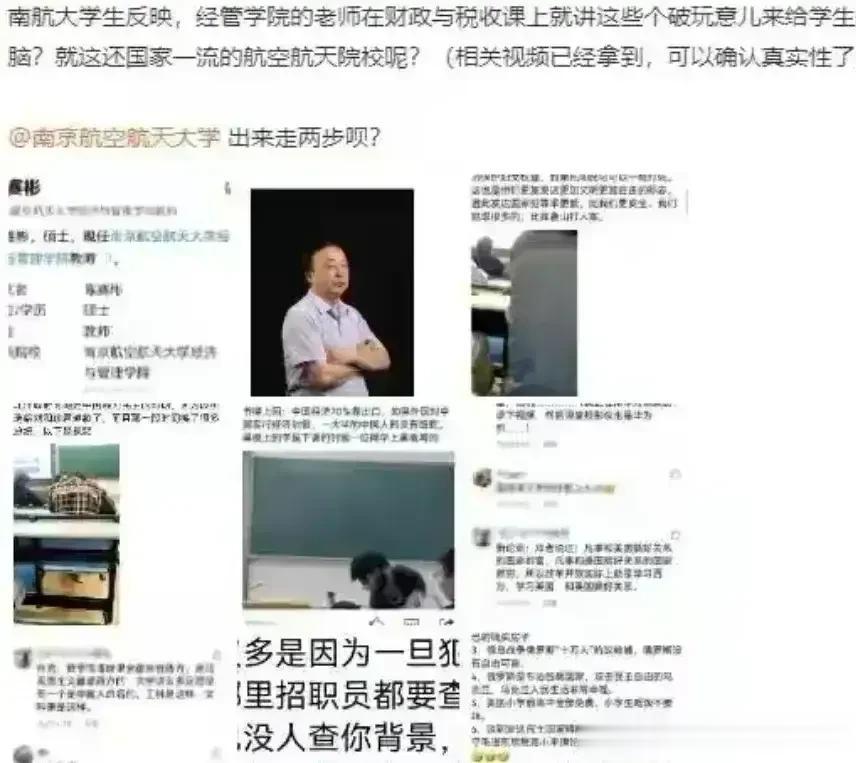 大家一起看看他说的这些话,大概能认可多少呢? 据南京航空航天大学发布的“情况说明”,该校有位教授的不当言论经网络曝光后持续发酵,目前该校已经就此展开调查。 可能他不止说了这些,但我们从网上搜集到的些许内容可以进行大致了解,他所说的想必就是这一类的内容。从字里行间所表达的意思看他是很认可西方的科技、文化,比较崇洋媚外这是显而易见的。也许正是因此,所以他讲课让听课的同学有些不舒适,于是录下来并发至网上。 作为一名教授,如此看轻自己实在不该,欧美的某些科技确实是比较先进,比如他说的电子产品方面,因为那是人家先发展出来的,我们作为跟进者还需要努力追赶并超越,这是时间的先后问题,没必要完全自卑。 再比如他说的70%靠出口,一看就是张口就来的,其实贡献率不到50%,可见治学不够严谨,不但自卑而且更是有些满嘴跑火车了。投资、出口和消费作为拉动经济的“三驾马车”,是缺一不可的,但他未经过考证和数据分析,就得出一个盲目夸大其词的结论,并随意在课堂上灌输是不对的。再说了贸易本身就是互惠互利,我们作为“世界工厂”,美欧也因此在全球化过程中受益,大家互相取长补短。 整体来看,他说的话过于偏激,而且有些言过其实了,即使有些内容是对的,但也不应该那么夸张。光是一味地崇洋是没什么意义的,他应该告诉大家我们该做些什么来积极改变,而不是自怨自艾地陷入满满负能量之中不可自拔。大家怎么看他的话呢?