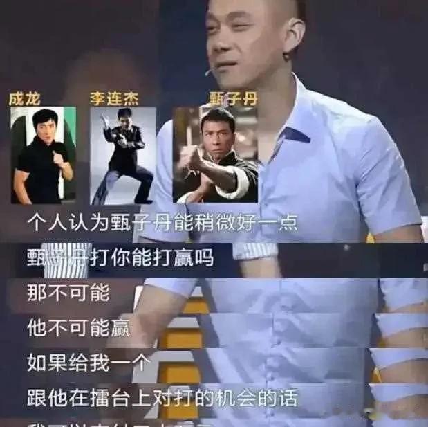 在节目中,鲁豫问吴京:“你能打赢洪金宝、甄子丹和李连杰吗?”吴京笑了笑说:“甄子丹真打不过,能打过洪金宝和李连杰。”鲁豫不理解的问道:“为什么?” 面对鲁豫,吴京说出了自己的想法:“因为现在洪金宝和李连杰都老了,如果再早十年,我也打不赢。” 原来如此,估计洪金宝和李连杰也没有想到自己会吃年龄的亏。 当然,这也从另一方面说明了吴京这个人情商很高,在这个如同“妈妈和妻子共同掉到水里先救谁?”这个送命题中,完美的突围。 不过,洪金宝、李连杰和甄子丹这三个人到底谁厉害呢? 这个问题曾经涂磊在节目中也问过一个资深武行,这名资深武行的回答是:就实战而言,甄子丹最厉害,因为甄子丹练过跆拳道。 他直言,我们练套路的人去跟散打打,比如说我练了十年的套路,他只练了一年的散打,那么我也绝对不可能是他的对手。 不过他也说,就表演而言,李连杰的身法动作更漂亮。 这个问题回答起来确实有点难,不过也有网友调侃,其实他们都不厉害,马云最厉害,因为《功守道》中甄子丹、李连杰和吴京分别是几个功夫高人,但在马云的梦里全被他打败了。 不得不说,还是网友见解独到!