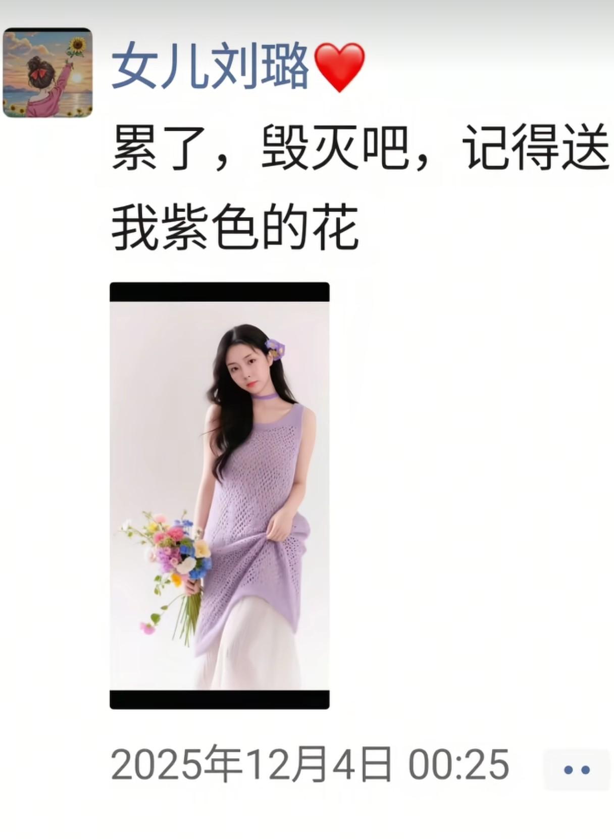 事情发生在四川内江,12月4日凌晨,刘璐在朋友圈悲观地留下了最后的话语,配图里她穿着自己最喜欢的紫色裙子,留言记得给她上紫色的花。