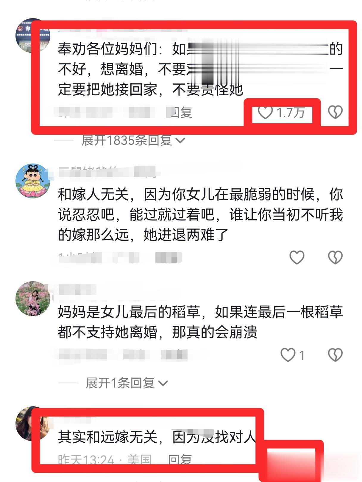 妈妈视频的评论区底下,有一条1.7万赞的评论:如果女儿给你打电话说过得不好,想要离婚,不要劝她忍下去凑合过,一定要把她接回家,不要责怪她。