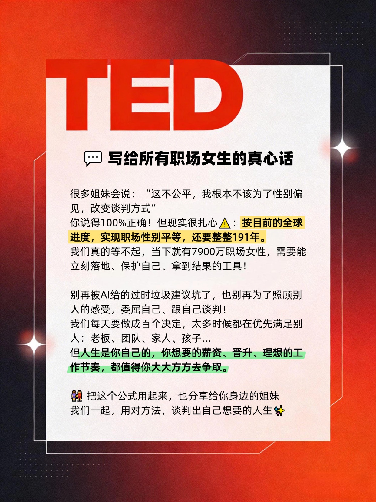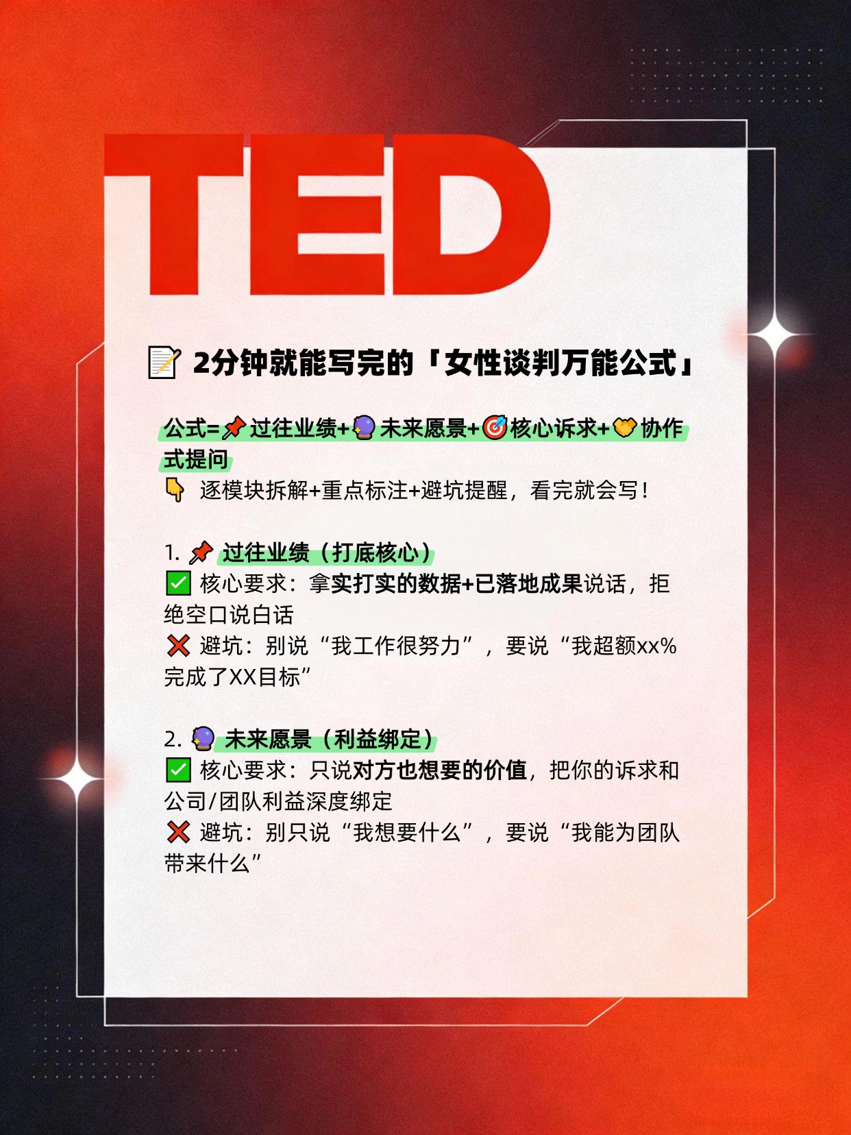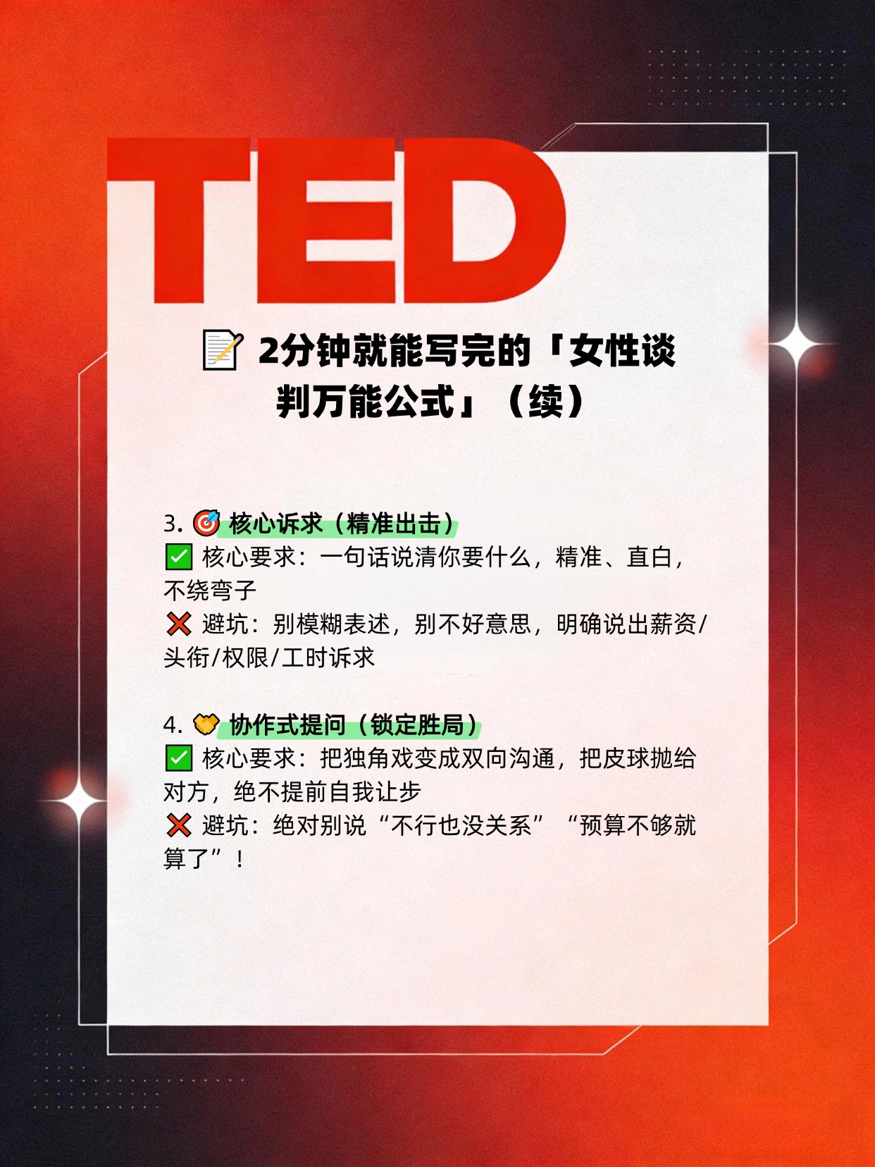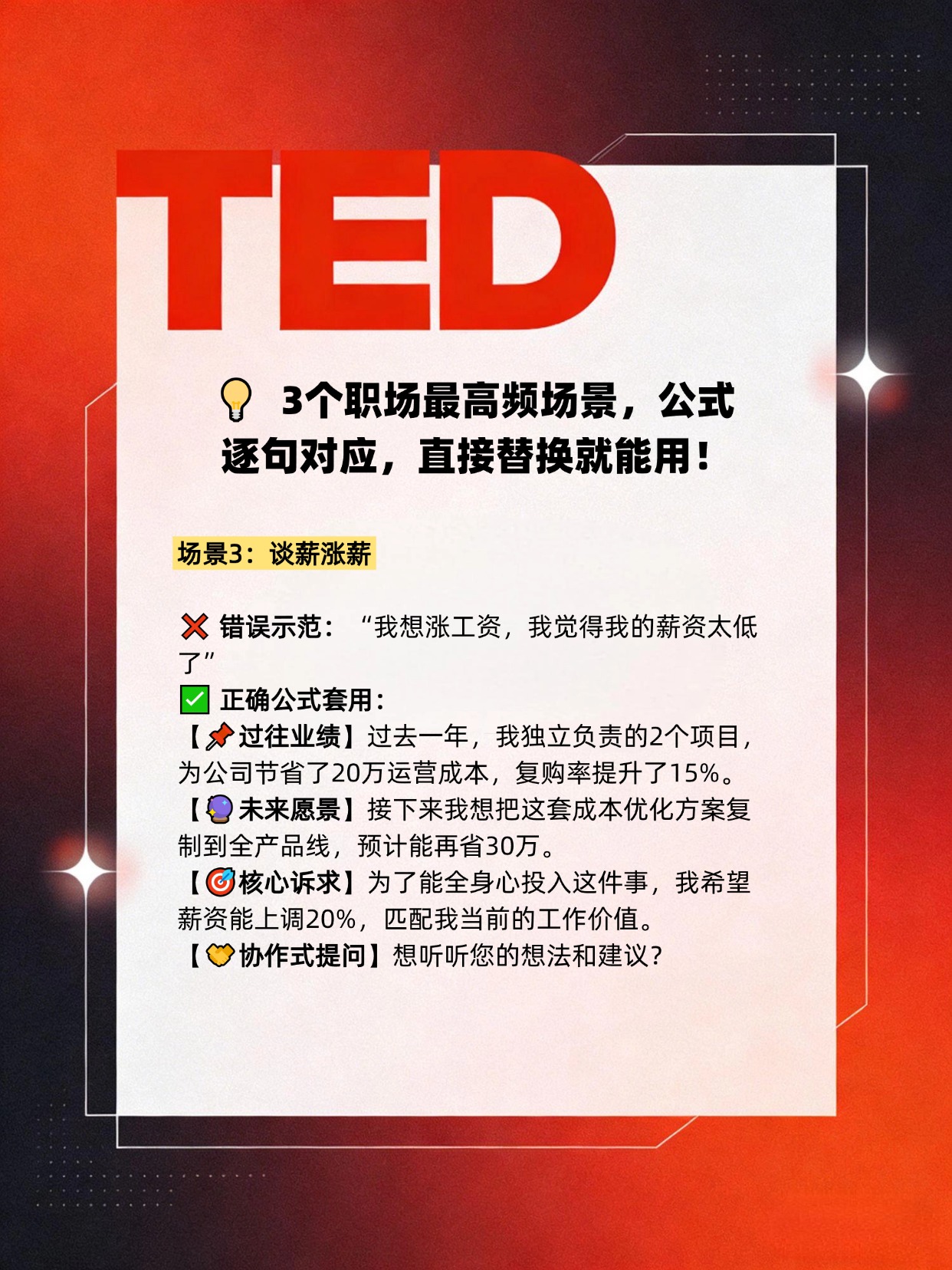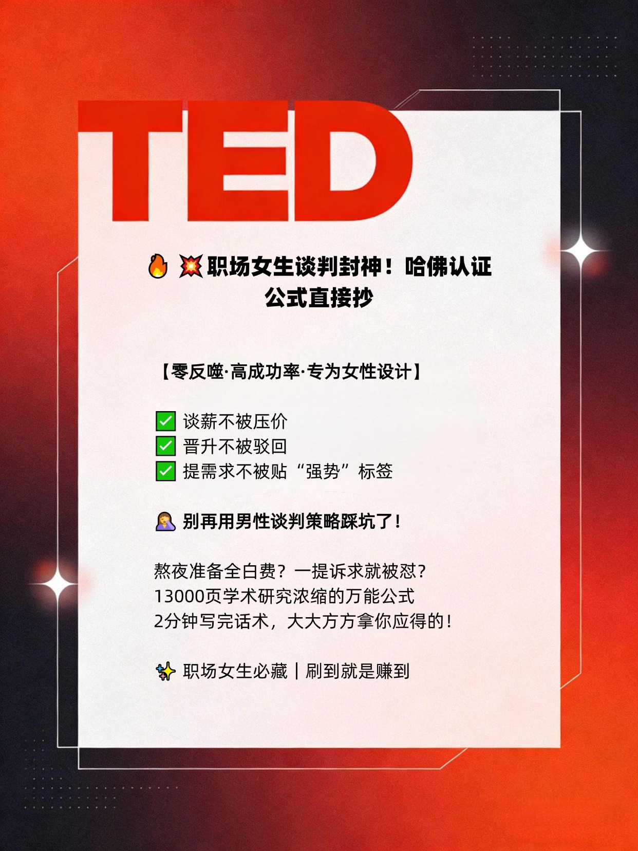 这套专为女性设计的关系型谈判法,完全避开了性别偏见的坑,既稳稳拿到了结果,还能给领导留下“有规划、有格局、懂协作”的好印象。 谈薪、晋升、争取项目资源、申请灵活办公,所有职场场景都能直接套,2分钟就能写完你的专属话术,看完赶紧用起来!