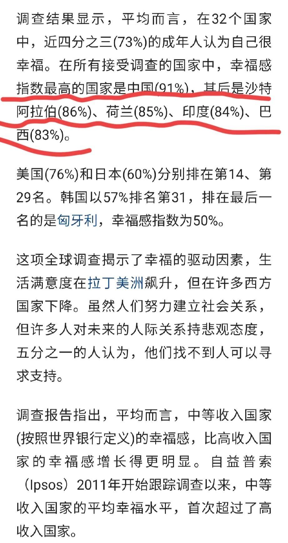 不知这家国际知名民调机构是怎么调查的呢?得出结论就是中国人幸福感位居全球第一,幸福指数达91%,紧随其后的是沙特和荷兰,印度、巴西分别排第四、五位,而美国等、日本等发达国家都排在了十名开外,尤其美国更是排到了第14。 说实话,如果单从榜单来看,那无疑是非常自豪的排名。