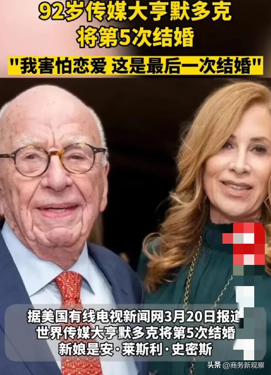 这家伙不光是有钱,看来还真是有个很棒的身体!一次又一次的结婚离婚,特别是强壮的体魄对他现在而言,可能应该要比财富更值钱!他似乎是结婚结上瘾了?说不定婚姻就是他长寿的秘诀之一…… 92岁的高龄了,说什么害怕恋爱,这是最后一次结婚,想法倒是很实在的,毕竟恋爱很耗费时间,更需要大把的精力,即使他认为精力充沛,但关键是他已经自知时日无多了,也真没那么多时间去恋爱,还是多一次结婚更实在些,补齐一个巴掌了(五次)。 以前听过一首歌,歌词中有一句:有钱的时候没时间,有时间的时候却又没有钱。可对默多克来说,是既有钱又有时间,而且还有个好身体,真是不枉此生了!我觉得婚姻对他来说,很可能是长寿的秘诀,不然他为什么一而再再而三的结婚呢?说不定这第五婚,又可能给他增寿好几年。头条热榜