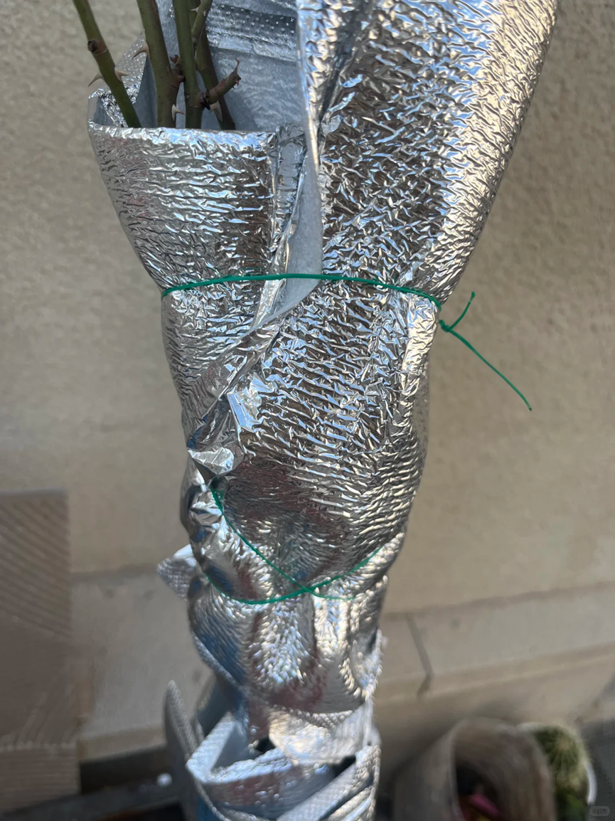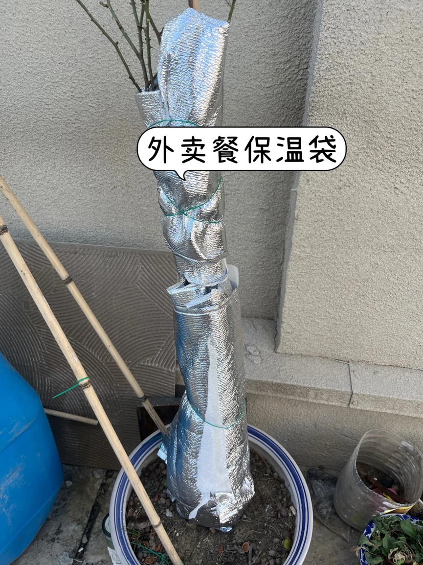 在不方便将这些花搬到室内养护的情况下,大家就可以利用外卖保温袋来进行过冬防护。