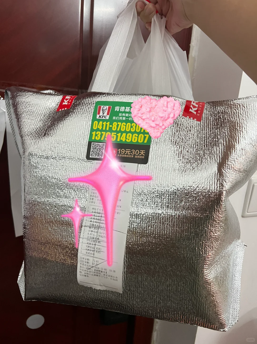 秉承着能省则省的原则,摆摊的朋友就直接将自己点外卖的袋子翻了出来,当做了出摊保温神器。