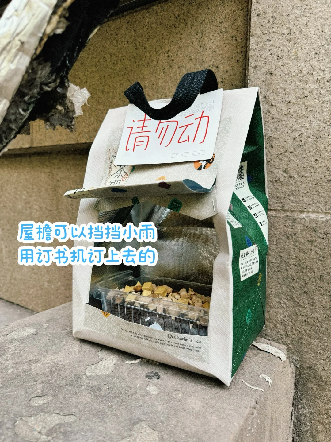 除了使用外卖保温袋给流浪猫制作小猫窝以外,一些朋友也想到了直接利用外卖保温袋来当做喂猫的工具,这样放在里面的猫粮就不用担心会被雨水浇湿了,感觉也很实用。