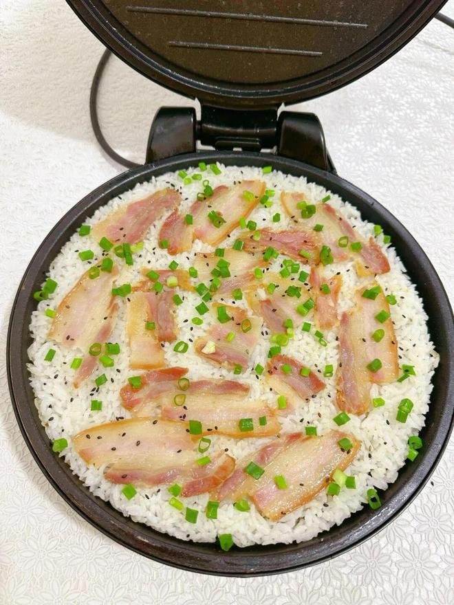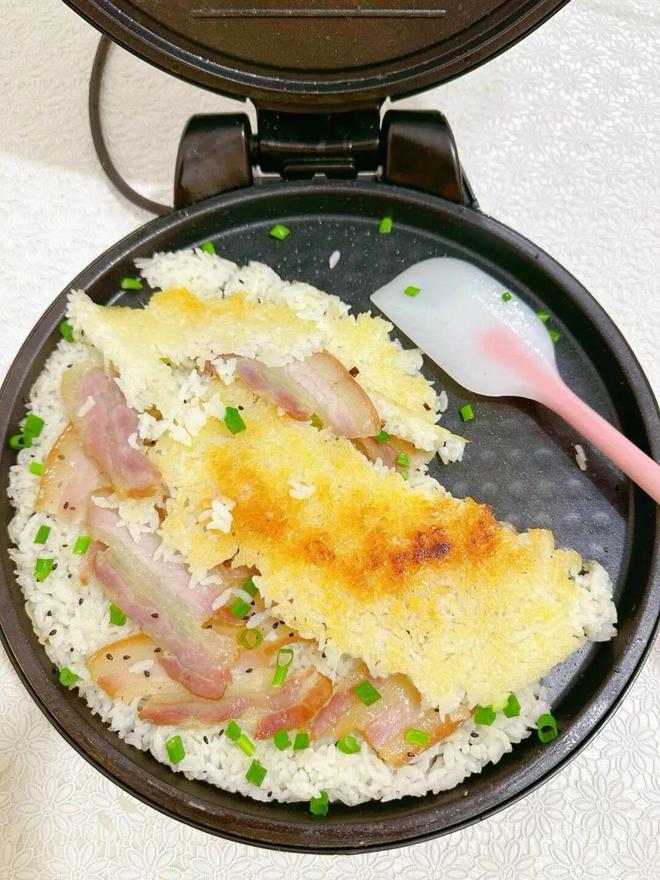 剩米饭吃不完,可以用电饼铛做一锅腊肉锅巴饭,菜和饭都有了,一口咬下去,那叫一个满足。
