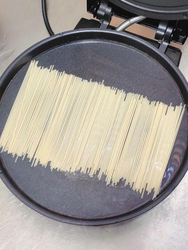 方法如下:挂面折成合适长度薄薄地铺在电饼铛中,倒水盖过挂面,盖上盖子焖到水干就基本熟了。