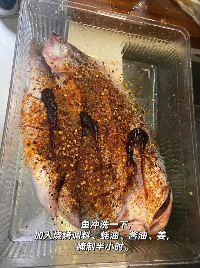 去腥后再冲洗一遍,加入烧烤料、蚝油、酱油、姜,均匀涂抹后,腌制半小时左右。