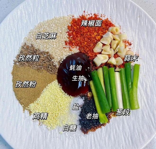 白芝麻、辣椒面、蒜末、葱段、老抽、盐、白糖、鸡精、孜然粉、孜然粒、蚝油和生抽,等于万能腌料,烤啥都好吃。