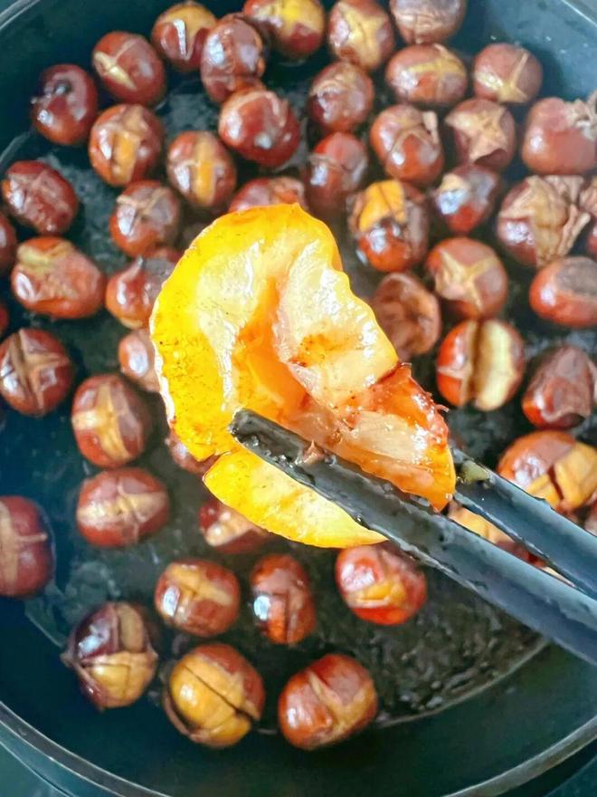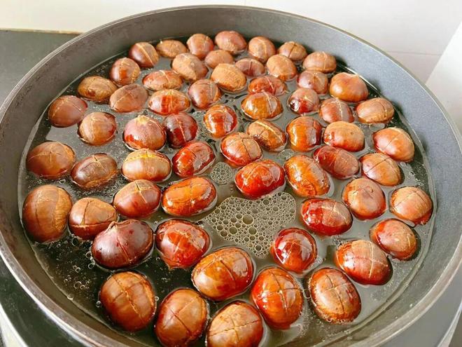 开大火,直至水烧完,观察板栗开口情况,如果开口不多,就再加点水继续煮,最后刷上蜂蜜水转小火再煮5分钟左右即可。