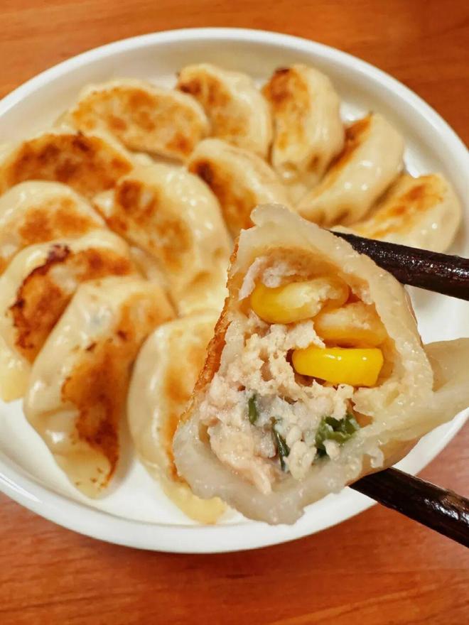 打开锅盖,再煎一会儿,听到滋滋响,饺子底部变得金黄酥脆就可以了。