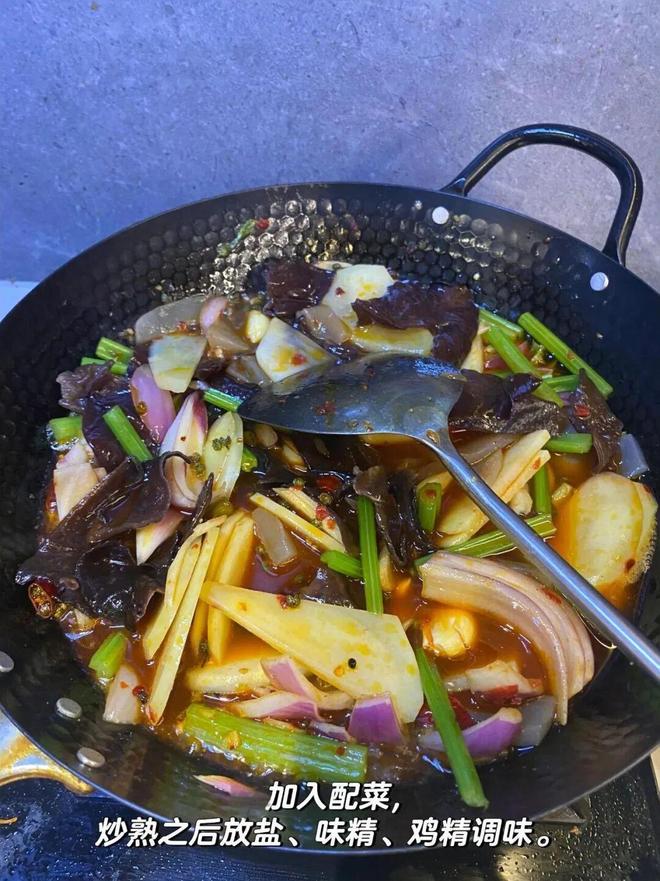 热锅烧油,加入花椒、豆瓣酱、姜蒜、辣酱段、葱头,炒香后加入土豆、芹菜、洋葱、木耳等配菜,并放盐、味精、鸡精调味。