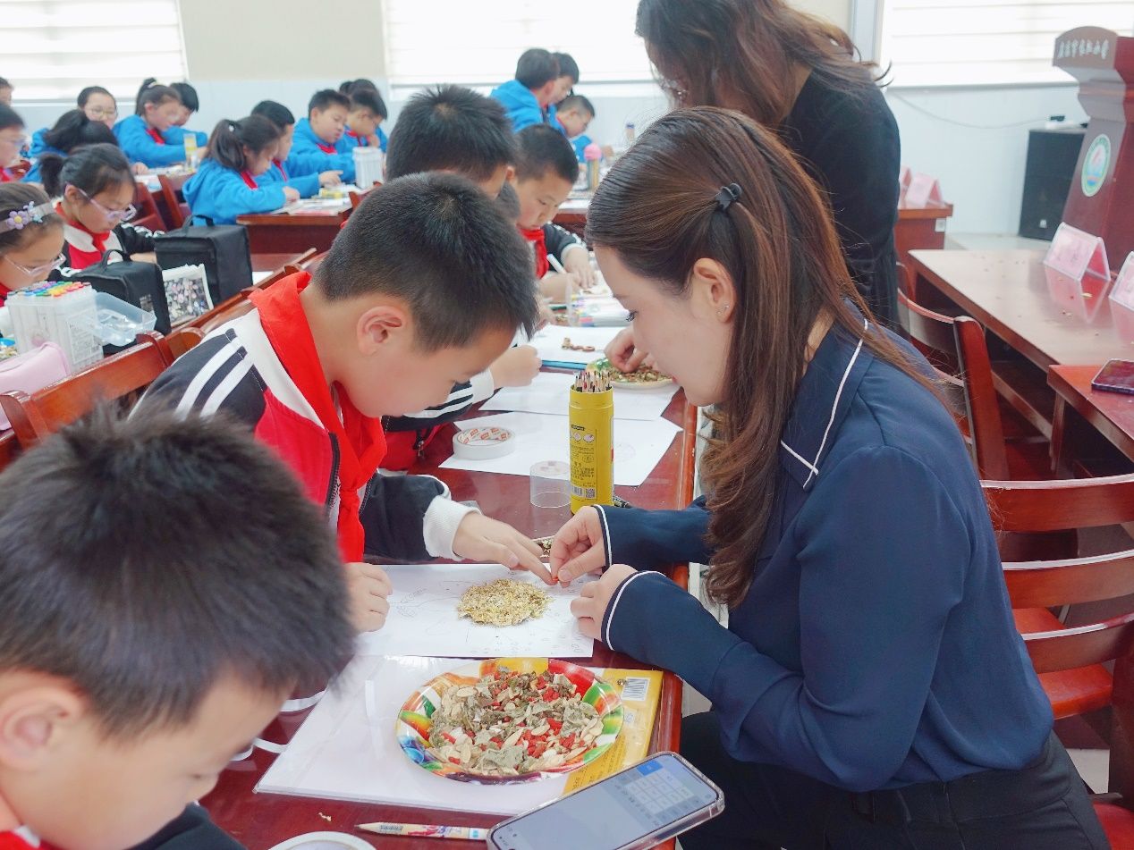 (图为王海燕带领在校的小学生们做中药材手工贴画)