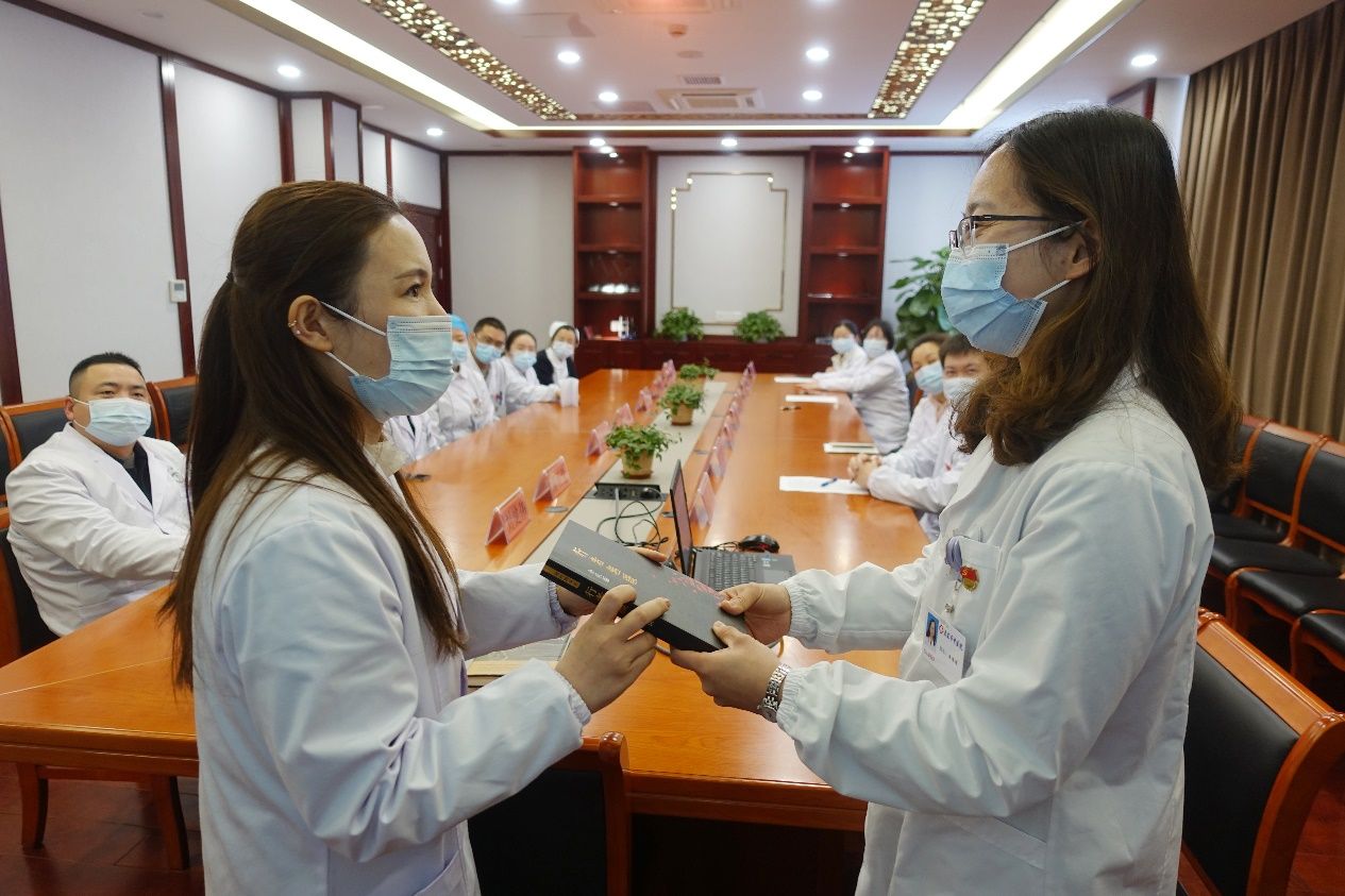 (读书分享会的最后,王海燕(左一)给年轻党员赠书)