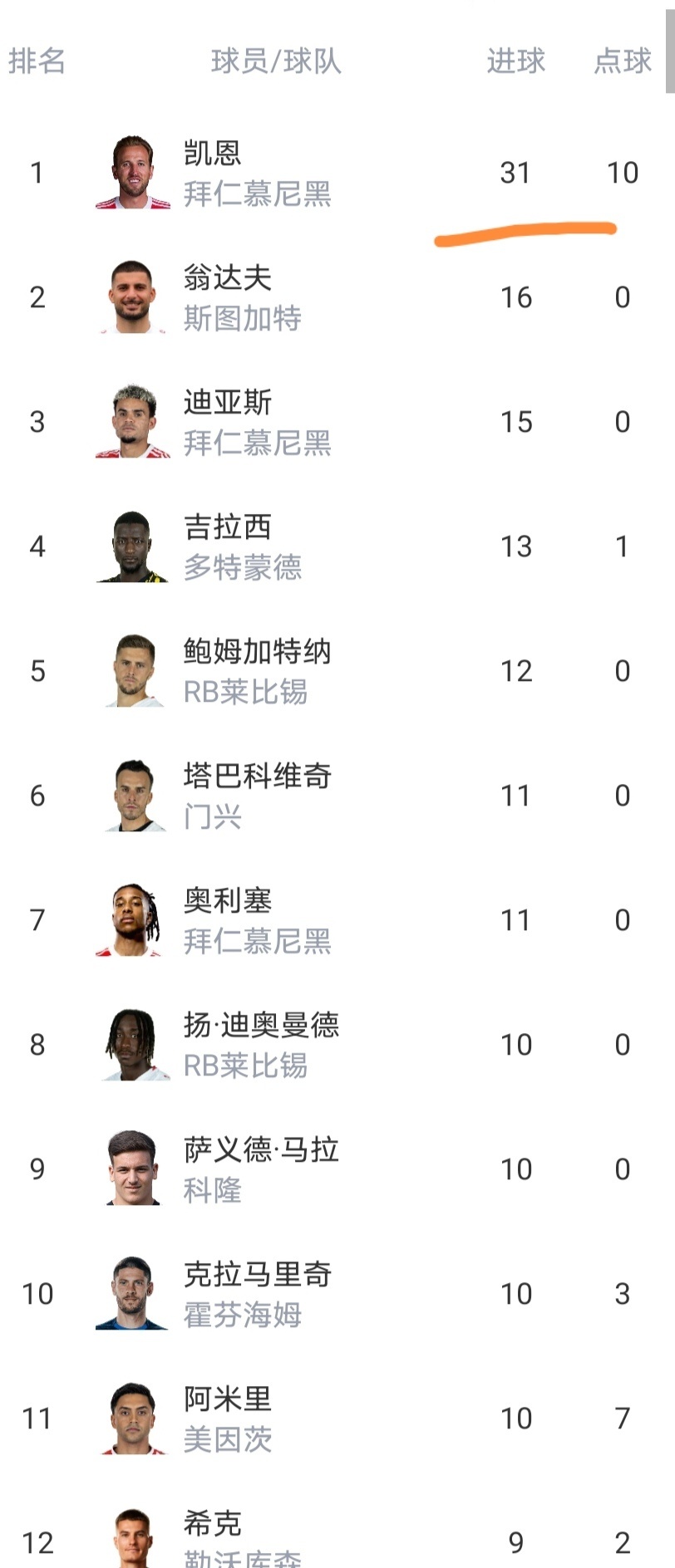 射手榜凯恩31球领跑,领先优势巨大。