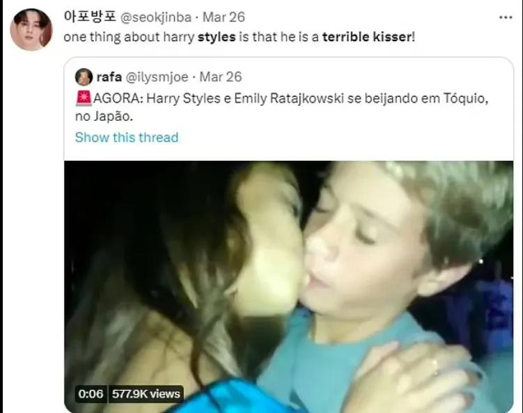 哈卷是不是该找人教他怎么接吻了? 近日,哈卷Harry Styles和艾米丽·拉塔科夫斯基 Emily Ratajkowski在东京街头接吻被拍,引起了哈卷的粉丝们的热议,并给他定位“糟糕的接吻者标签”! 看到哈卷和艾米丽接吻,网友纷纷吐槽:他为什么接吻这么笨拙啊? 他可真是个糟糕的接吻者! 他为什么吻的如此尴尬? 我很伤心,我刚刚得知哈卷实际上是一个糟糕的接吻者! 过去发生的一连串尴尬事件后,需要有人教他如何接吻! 他像一个 12 岁的孩子一样接吻! 被网友们的评论笑不活了,情侣接吻被吐槽还真是少有[左捂脸]看来接吻也是一门学问,哈卷不行得补个课!