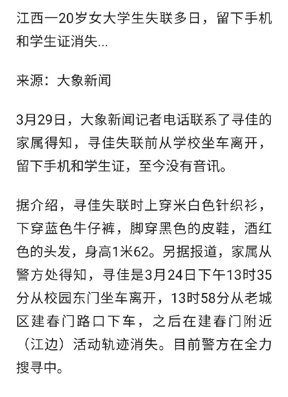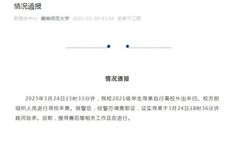 这是一个令人悲伤的消息!从失联到已被警方证实跳河自杀,仅仅一周的时间,接连听到这些沉重消息的小佳(失联女大学生)的父母不知该有多痛呢? 据小佳的母亲英女士介绍,女儿今年20岁,自己从其舍友那里得知,她于24日走出校园后失去联系。她还说在失联前,小佳曾与隔壁宿舍同学闹过矛盾,当天她答应舍友晚上9点回来,但是一直没有回宿舍。 没想到这一走就再也回不来了,从当地警方30日所发的这份警情通报看,小佳系跳河自杀。目前,搜寻善后等相关工作正在进行。 从当前看到的信息来看,小佳除了出走之前与隔壁宿舍同学闹过矛盾外,好像并没有什么其他的事发生。如果仅仅是这些就想不开,甚至要不惜以结束自己的生命为代价,那这个代价也太大了!同时也说明她的心里太脆弱了,一点小小的挫折就压垮了一个大学生,使其走上了极端,如此弱不禁风的样子看来承受不了任何委屈,这估计与家教不无关系,可能从小到大在家里就没有受过一点气,顺风顺水惯了,当与别人发生矛盾后缺乏有效的沟通,以及处理事情的能力,有些手足无措。 当前社会发展太快了,很多事情尤其是人与人之间的关系变得也不像过去简单了,不论是社会上还是校园里都是一样的。想要立足得有知识,但不能仅仅是有知识就行,知识与处理事情等能力还是有很大的差距。 头条热榜