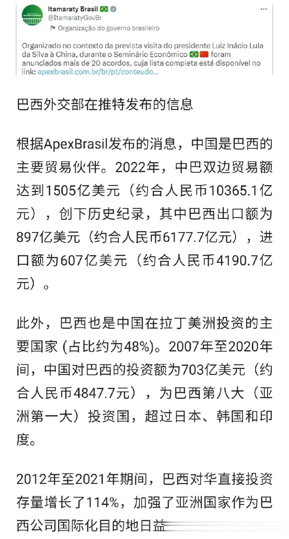 这是利好消息!先是俄罗斯表示会在合作伙伴之间使用人民币进行支付,现在又是南美最大经济体的巴西,这意味着“金砖五国”里面已经有三国愿意使用人民币。为什么会这样呢? 很明显,随着美元本身的力量使用过度,加上美国公信力的渐失,再加上美国动不动就搞单边制裁,以及国际地缘政治的风险加剧,让越来越多的国家意识到为避免金融制裁风险而减少使用美元的必要性。 根据巴西与中国达成的这项协议,未来的双边贸易将使用本币而非美元,即雷亚尔与人民币可以在贸易中进行直接兑换结算。该项业务将由中国交通银行控股的巴西BBM银行与中国工商银行(巴西)具体负责。 值得一提的是,中国作为全球第一货物贸易大国,如今已经是120多个国家和地区的最大贸易伙伴,同样也是巴西的主要贸易伙伴。2022年,中巴双边贸易额达到1505亿美元(约合人民币10365.1亿元),创下历史记录。而当年中俄双边贸易额逾1900多亿美元,预计将会在2024年突破3000亿美元。另外,中国在拉丁美洲投资的近一半是在巴西。 由此可见,中国与俄罗斯、巴西等之间进行以人民币支付的双边贸易,这对人民币国际化以及国际货币体系再平衡起到了重要作用。尽管合计贸易总额还不到5000亿美元,相较于我国已经超过7万亿美元的对外贸易总额而言,只有十几分之一,但这一趋势对全球“去美元化”进程是一次有力的推动!还有一个重要的信号,就是我们不断减持手头上所持有的美国国债,除了收益因素影响外,这本身也有对未来金融风险的考量。头条热榜