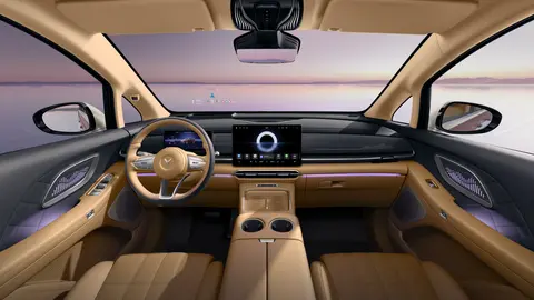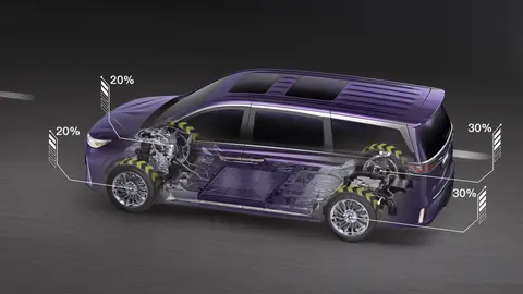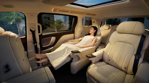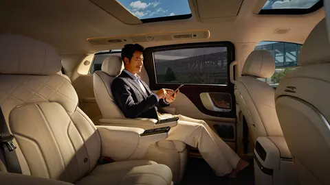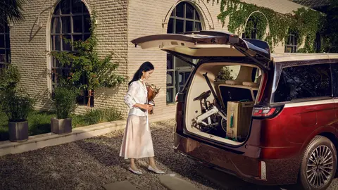 车身侧面采用 MPV 常见的实用设计:平直车顶为后排乘客预留了充足的头部空间,相比溜背设计更注重乘坐舒适性;悬浮式车顶搭配 20 英寸多辐轮毂(匹配 255/50 R20 规格轮胎),让车身长度超 5.3 米的车型不会显得过于笨重。电动吸合门与电动侧滑门属于该级别车型的常见配置,商务接待时方便乘客优雅上下车,家庭使用时也能为老人、孩子提供便利,隐藏式滑轨还让车身侧面视觉更整洁,避免了传统侧滑门轨道凸起的问题。