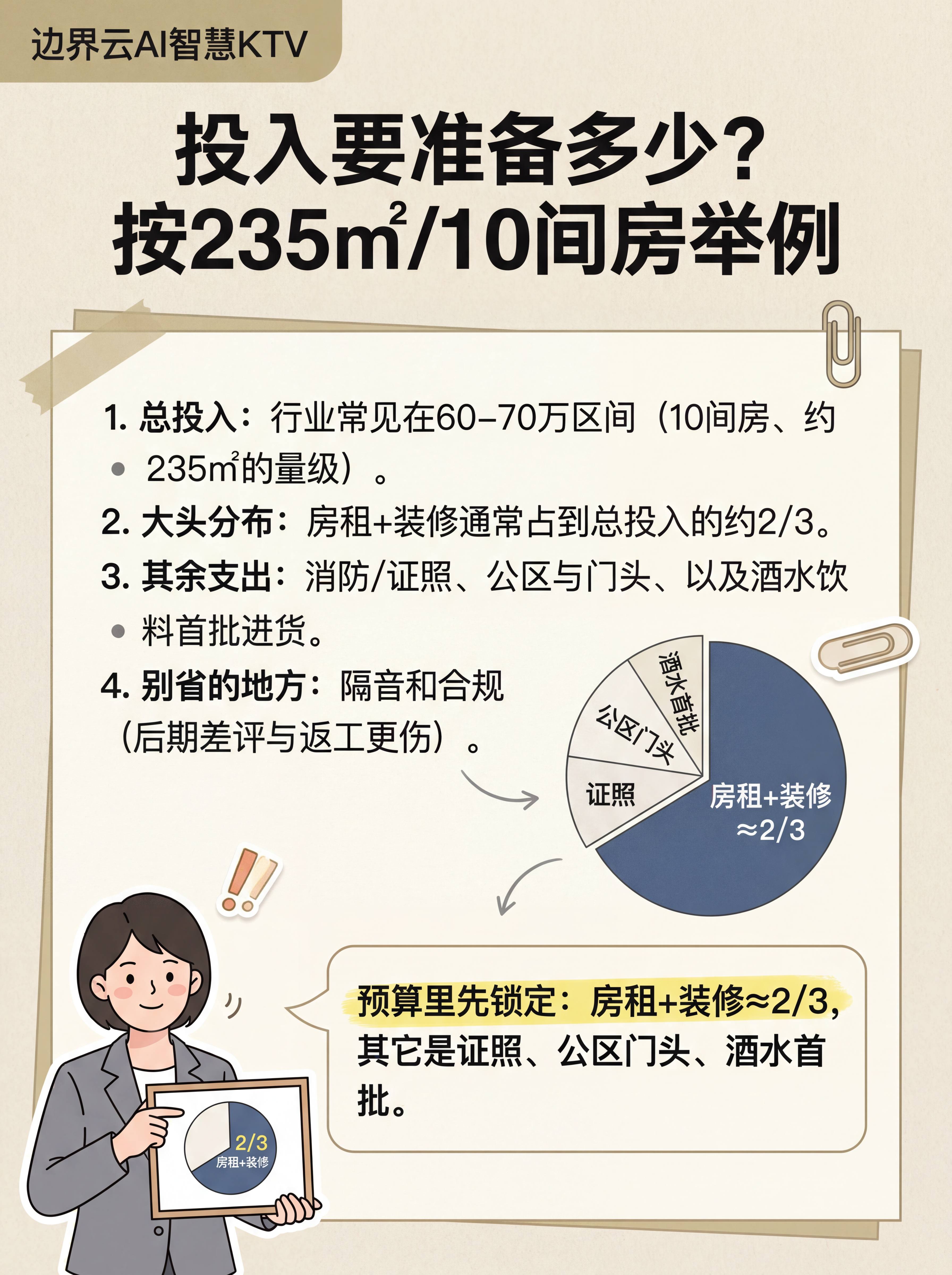 10间房、235平的店,总投资大概在60到70w。房租和装修占大头,差不多三分之二。剩下的三分之一分给几个地方:消防改造、证照办理、公区装修、门头设计,还有首批酒水进货。