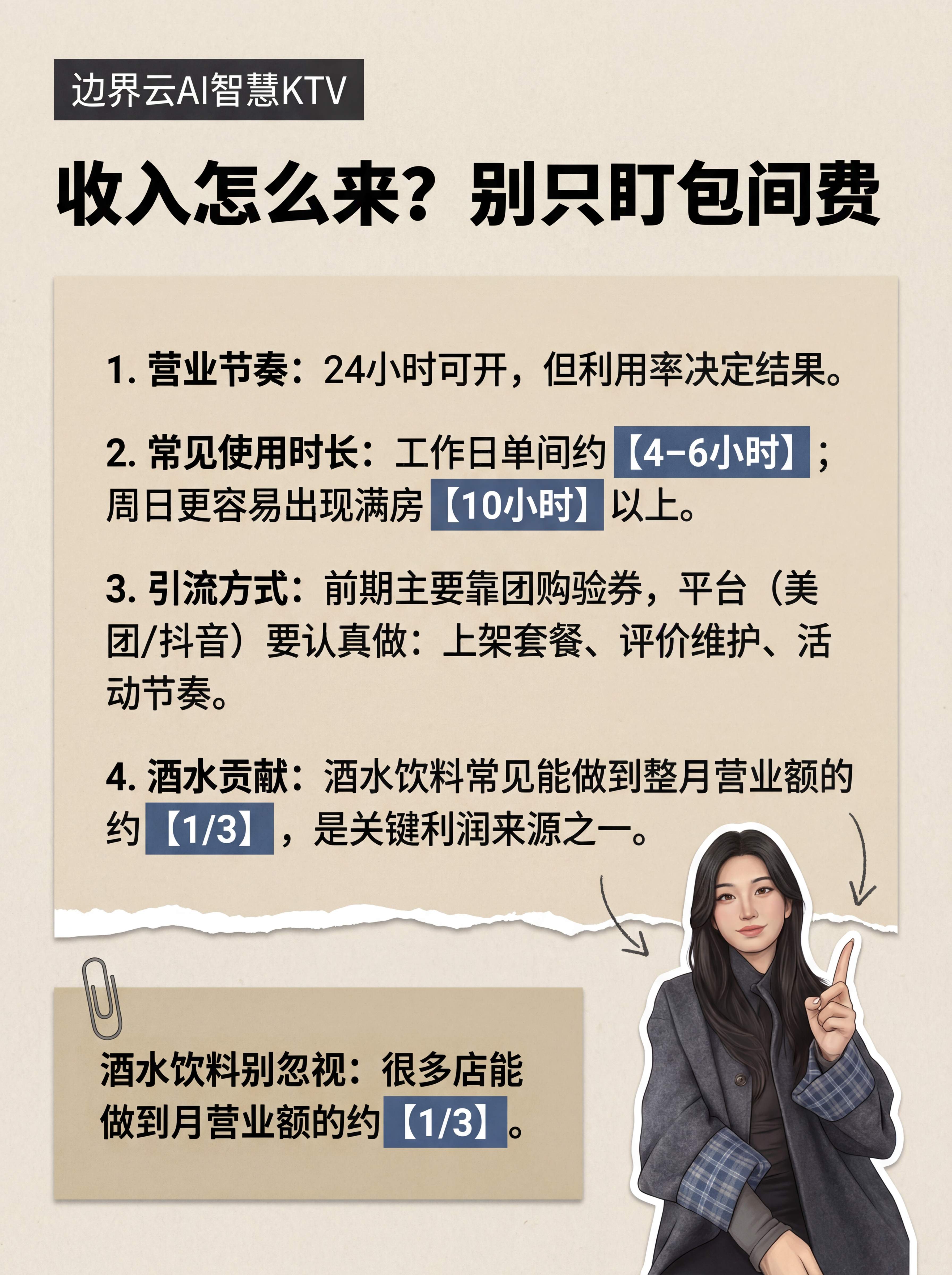 很多人觉得自助KTV就是卖时间,一小时多少钱,乘以房间数,再乘以天数,就是收入。这是最常见的误算。真实情况是,酒水才是利润大头。很多店里,酒水能占到月营收的三分之一左右,而且毛利高,卖一瓶饮料的利润抵得上半小时房费。