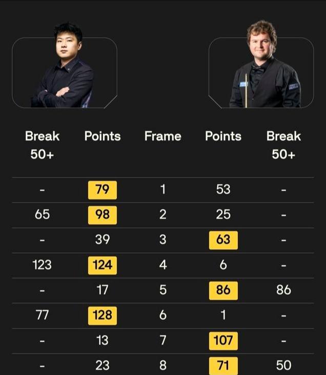 在最为核心的进攻效率方面,赵心童的优势十分明显。他的总得分达到593分,领先对手多达133分。进球率上,赵心童以70%比66%占据上风,而在高分局面的掌控上,赵心童打出了1次单杆破百和2次单杆50+,其单杆最高分定格在123分。相比之下,海菲尔德虽然也交出了2次单杆50+的数据,单杆最高分为86分,但在绝对火力上依然稍逊一筹。