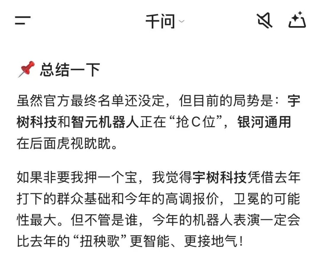 去年是宇树科技的花袄儿机器人扭秧歌,今年谁有这个登台机会?反正看热闹不嫌事儿大,这个问题我也抛给了千问: