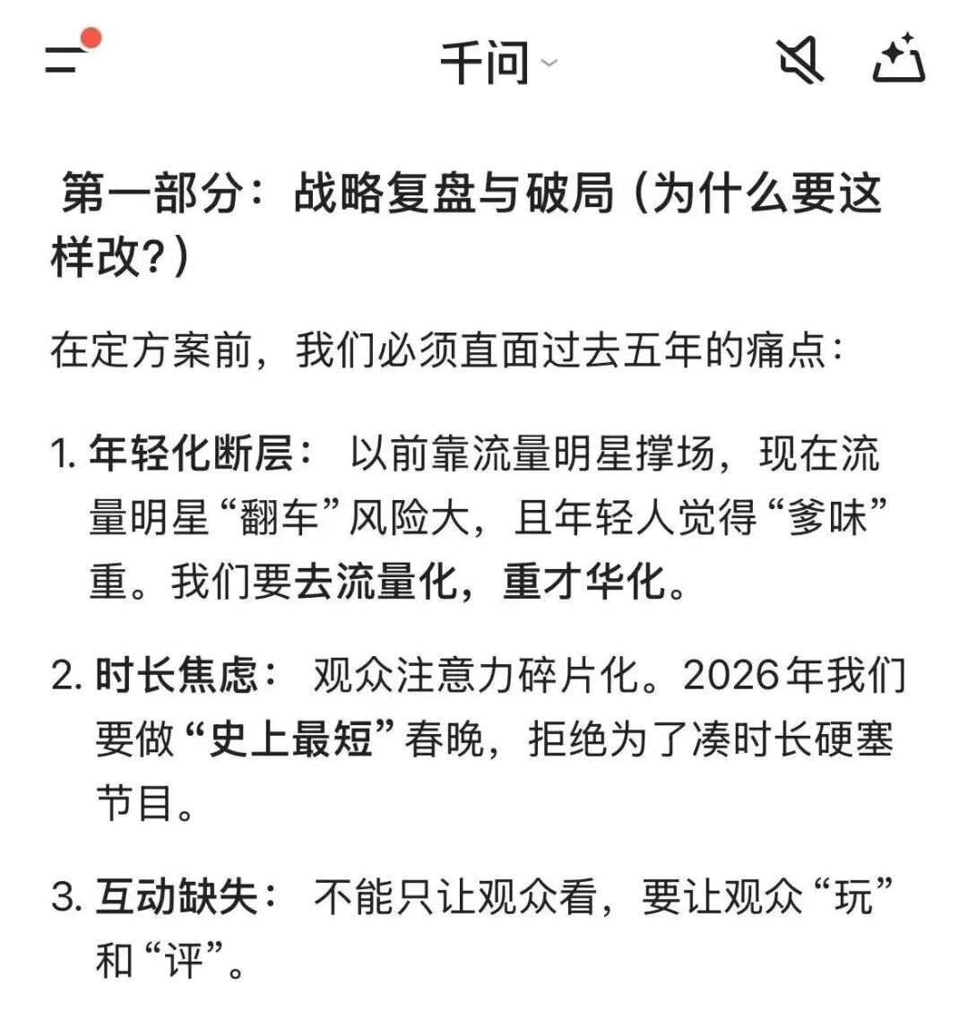 看到这个解释的那一刻,我真恨不得把我掌握的互联网黑话都丢给千问——你这方案没有用户思维,颗粒度太粗了,也没有实现晚会与传播的闭环。