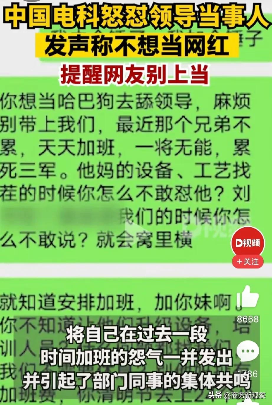 怒怼要求加班的领导,然后愤而离职,像这种一拍屁股就走人的做法,大概也只有个别年轻气盛的才干得出来吧?虽然他说不是为了想当网红,但不得不说他可能就要“红”了! 我们不妨先了解一下事情的原委?事情其实是这样的,陈某作为中国电科(CETC)成都区软件开发事业部的一名员工,因领导安排清明加班而暴怒,将自己在过去一段时间加班的怨气一并发出,并引起了部门同事的集体共鸣,纷纷要求辞职。也就是说,陈某的怨气冲天并仅仅因为要求清明加班这次,而是之前就已经累积了太多的气,借机给一股脑宣泄出来了,同时还将这种情绪感染到了其他人。 就这件事而言,我想简单聊一聊自己的几点看法: 一、我为什么一开始说只有个别年轻人会干出来这种事呢?因为年轻人一方面是比较年轻气盛,容易“管不住嘴”,尤其是情绪累积太多后,一旦找到突破口就可能会在一瞬间爆发;另一方面是因为年轻人忍耐力相对比较弱,而且可能不像年龄比较大的人那么有压力,所以才敢于轻易的拍案而起,与上司直接顶撞,也不怕之后的结果会怎样? 二、对于加班本身而言,我其实也比较讨厌那种动不动就要加班的公司,尤其是遇到节假日之类的休息时间,临时给你安排一下加班,这完全是不顾个人感受的,如果是那种非加不可的还可以理解。关键是有时候可能就是些无效的,就像陈某所说的事,某人为了自己的而要求着其他员工一起加的…… 三、现在有些公司的加班成为了常态,而且很奇怪的是,有些就喜欢看员工每天加班,却不重视日常工作的效率,本来可以日清日结的事,却没有及时去完成,反而在下班后又表现出一副努力的样子。更甚者就是这种在节假日里还没完没了的加班,只看工作时间的多少而不顾工作过程中的效率和质量。反过来,有些公司反而不允许加班,如果非要加班还需申请,因为员工加班时也是公司增加了成本。这就使得每天正常工作时间必须要拿出真正的高效率。 四、对于这位怼领导而离职的陈某,我觉得以后也要学会克制自己的情绪,有意见可以提,但要讲究方式方法,切记不要在公共场合比如微信群里发火,这样不仅影响不好,而且让对方没面子了,也就没了缓和的余地。 总之,每个人都有自己的脾气,但对于职场里的每个人来说,大家是在一个集体里活动,那就不能不照顾一下其他人的感受了,哪怕有火也得冷静下来,遇事多想一想,别那么盲目冲动,更不要出口成“脏”!要为自己的言行负责,更要为自己的前途负责!头条热榜