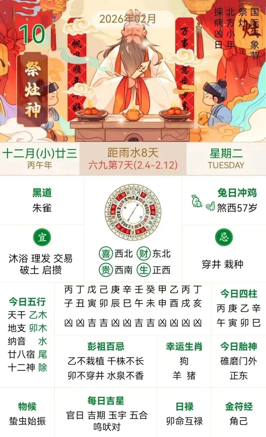 小运播报:2026年2月10日,星期二,农历十二月二十三(丙午年庚寅月乙卯日),法定工作日