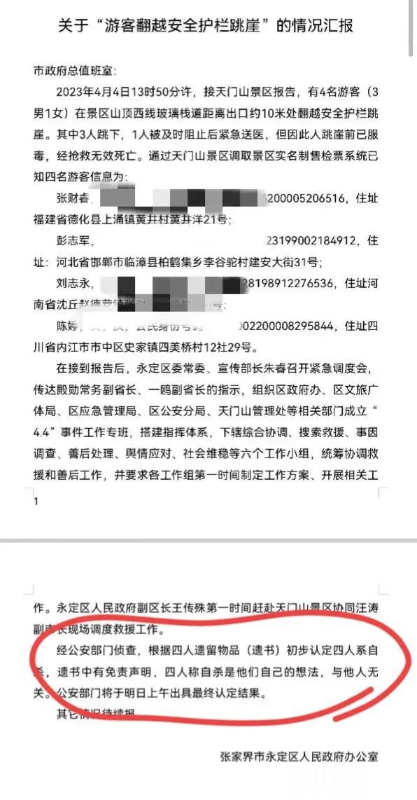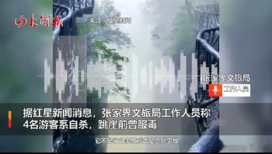 倒是不给别人添麻烦! 留下免责声明的遗书就这样走了?除了这三名跳崖者以外,实际上还有一位女孩在跳崖之前被景区工作人员拦住了,不过由于四名游客在跳崖前均服了毒,这个被拦住的女孩虽未跳崖,但也没有抢救过来,也就是说四人(三男一女)均系自杀。 惊闻这件事,说实话一下子惊呆了!据红星新闻消息,张家界文旅局工作人员称,4名游客系自杀,跳崖前曾服毒。 第一,从目前已有的信息来看,这4名游客好像并不是熟悉的人,他们应该是通过网络等方式一起相约来到了张家界天门山景区,既然是一起服毒又跳崖,那说明这4名游客到来之前就已经想好了,这一点可以从四人所留下的遗书就知道了,遗书中有免责声明:均称自杀是他们自己的想法,与别人无关。这样一来,倒是给警方省下不少事。与此同时,也可以让景区脱却了防护措施不力的责任。其中有一个临走前告诉家里,只说是自己出去旅游了。 第二,他们服毒跳崖的这种做法,那说明是为了“万无一失”的,换句话说,就是为了要确保可以自杀“成功”。要不然,被拦住的那位也不会因为抢救无效的,因为她自己服毒。这是去意已决!这更加说明四人已经是对生活万念俱灰了,才会如此不珍惜自己宝贵的生命。可是又会是什么样的原因让他们义无反顾的放弃自己呢?这恐怕很难搞清楚了,除非之后有对遗书进行全面的信息披露,或者要看后续会不会有其他与之有关的消息出来。但无论是哪种原因,想必都是足以压垮他们的……让他们完全绝望的因素。 第三,我原以为若一男一女相约自杀,那可能是出于殉情之类的,但是这起悲剧里面有四个人一起,真是让人想不通,会是什么的动因促使他们选择同年同月同日结束鲜活的生命?也许是我们想太多了,也许他们就是不想活了……但留下的启示是需要社会思考的,为什么会发生这样的事,除了个人及家庭等因素,恐怕也与其他环境等大的问题不无关系吧! 头条热榜