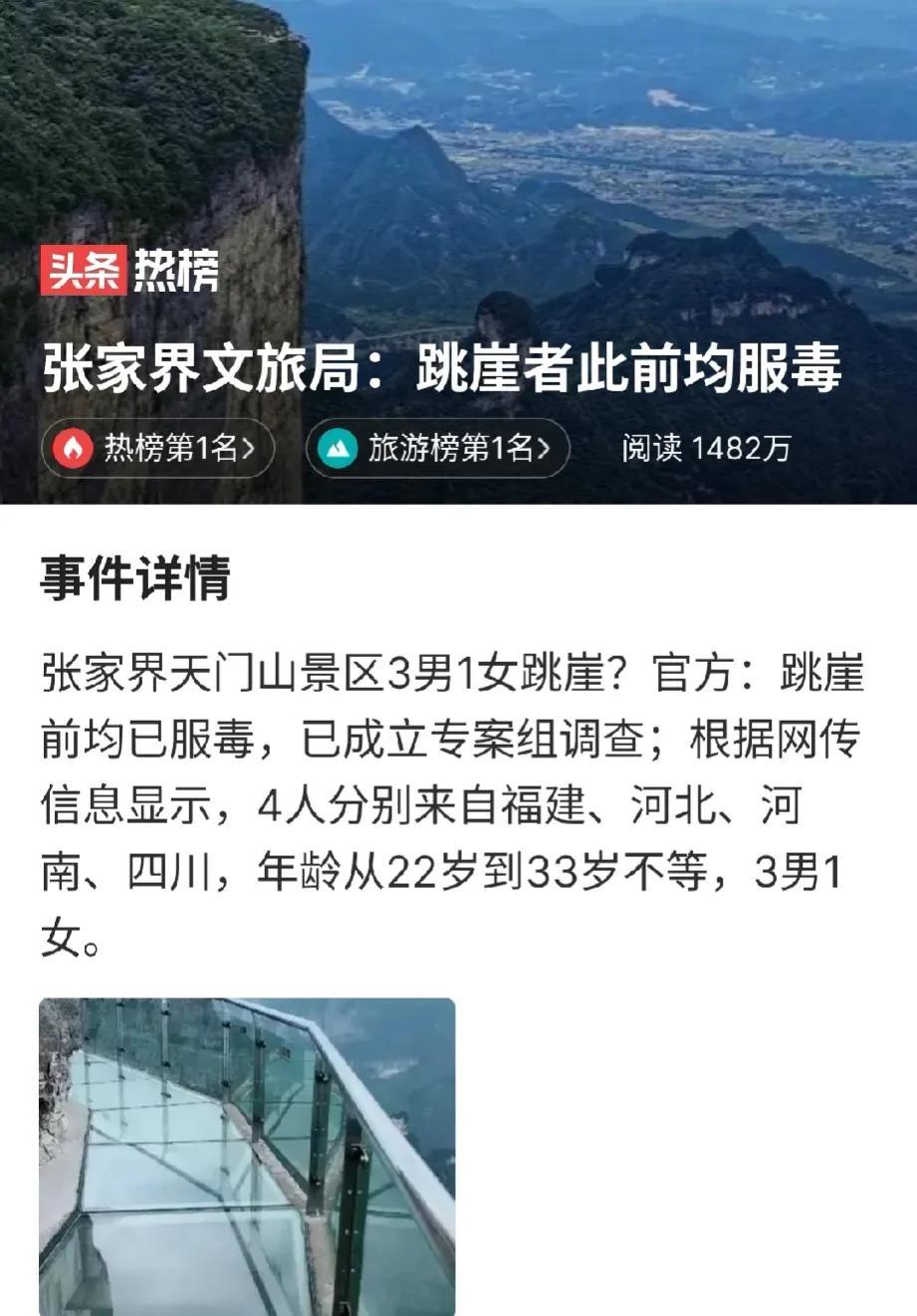 此时此刻,让我不由得想起了唐代白居易的那首诗——《琵琶行》中的后两句:同是天涯沦落人,相逢何必曾相识。其实,这首诗的前两句很多人可能并不熟悉:我闻琵琶已叹息,又闻此语重唧唧。如果大家连起来读一下,是不是会有更深的理解呢…… 为什么想到这首诗呢?因为4个年龄不等又是来自不同地方的游客,却在同一天选择了同一种了却自己的方式,这确实有点匪夷所思。 说句心里话,看到这一消息后,我真是惊诧万分!心里连着问了好几遍,这是为什么呢?从红星新闻的消息看,要不是因为这四名游客提前服毒的话,至少还能有一名可以被救下的,只因为她自己服毒在先,所以哪怕被拦住了,但最终仍然是抢救无效……真是一起令人唏嘘不已的悲剧! 四个分别来自河北、福建、河南和四川的年轻人(年龄从22岁到33岁不等),据报道称,都是在外打工的,而且好像家境也都不是太好,这倒是可以想象的到的,也许正是因为“同是天涯沦落人”,他们的相逢是首歌,但却是一首悲凉的“诀别”,我相信在此之前他们可能真的并不相识,但不知因何机缘巧合之下却又走到了一起,并成为相知的“朋友”,而且还是一路“走到底”的那种……真是令人扼腕叹息! 原本这种“同是天涯沦落人”应该互相鼓励且帮助着走下去,活下去才对,这也恰恰是诗人白居易的初衷,可没想到的是,他们反而是反其道而行之!这正是我不能理解的,毕竟有如此的“志同道合”取向,怎么就不能更有勇气一些呢?要说没勇气其实也不对,可他们的勇气用错了方向。 有一篇报道中提及,说四名游客中的一位好像是有一些网上小额贷款,具体情形不明,我也不好直说,但如果他们真是与此有关,那其实更没必要那么做,毕竟最大的也不过才33岁,小的甚至刚22岁,即使是有点负贷压力也不该走向极端,只要再咬牙坚持一下说不定就可以挺过去了,无论多难但只要活着努力着,就一定会有希望的! 不论是出于什么原因,我觉得主动放弃都不是理想的结果,也不该成为年轻人的选择。走到一起可能各有各的苦,但人生还有很长的路要走,为什么要走不归路呢? 头条热榜