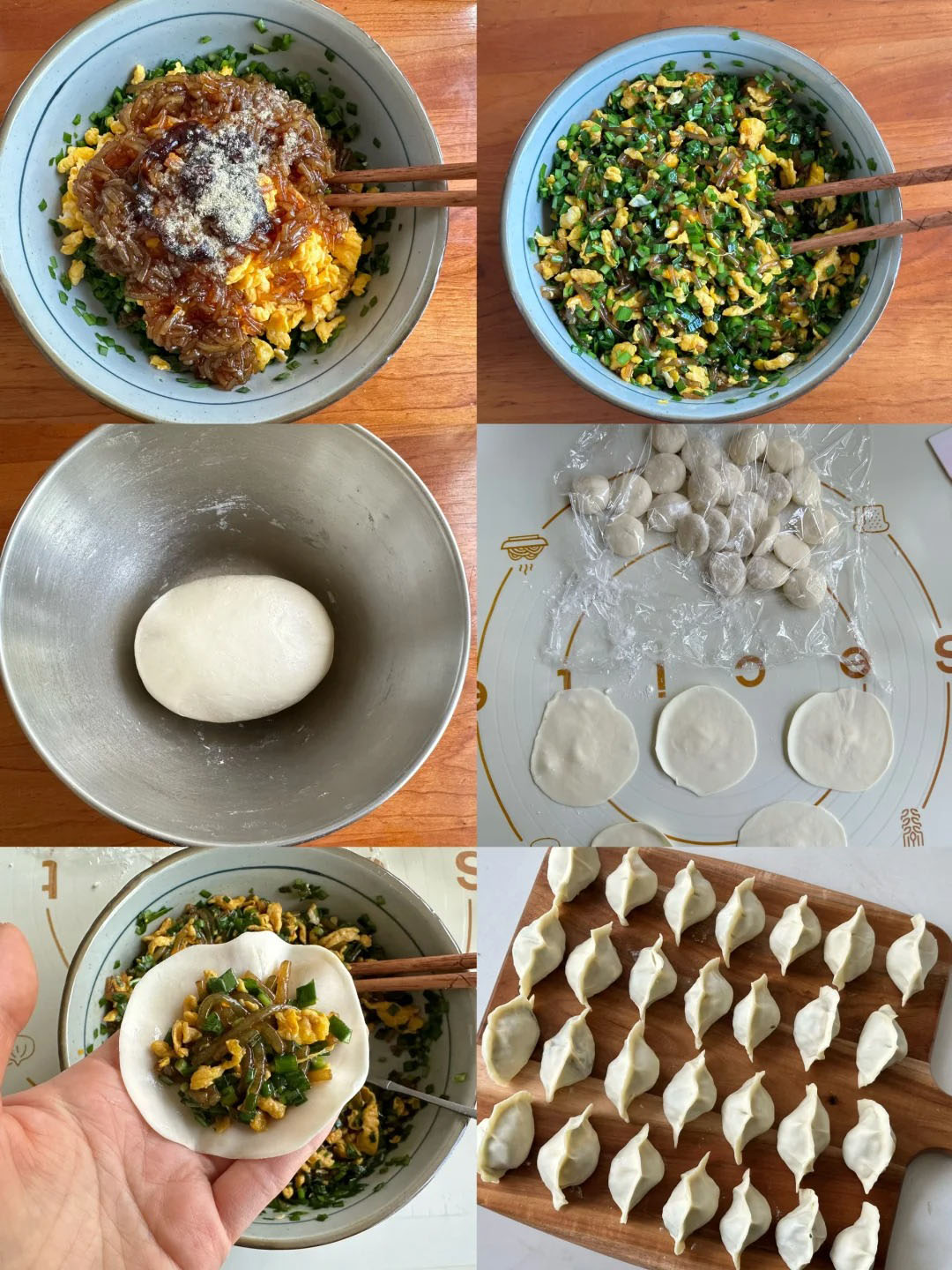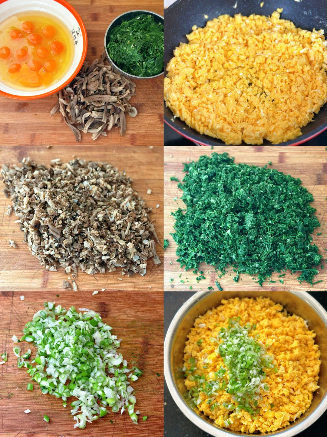 食材:荠菜500克、干鹿茸菌300克、柴鸡蛋12个、大葱1棵、饺子皮适量