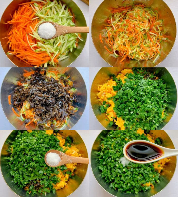 2️⃣放入切好的韭菜,木耳碎,炒熟的鸡蛋碎,再放少许盐,一勺生抽,一勺蚝油,一勺芝麻油,一勺虾皮,放胡椒粉鸡精,拌匀即可。