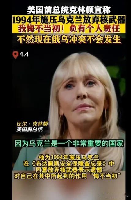 这个时候他又想起说这事了,这不是往乌克兰的“伤口上撒盐”吗? 克林顿最近在接受采访时说,他为自己当年让乌克兰“无核化”而感到非常后悔,还说如果乌克兰有核武器的话,俄罗斯还会做出这种事情来吗?当然不会了,但是我觉得这也怪乌克兰自己太傻太天真了,轻易就放弃了核武,原本乌应该是世界前三大核武的国家之一。而且乌克兰在军事工业方面的技术也是数一数二的,后来我们在军事工业技术上的某些进步,应该是从乌克兰那里受益匪浅。 另外,他还提及1994年的《布达佩斯安全保障备忘录》,它规定乌承诺放弃苏联时期部署在其境内核武器,然后由美、英、俄作为担保方来保证乌克兰主权和领土完整。 很显然,俄并没有按照这份备忘录行事,不仅不愿保证乌主权和领土完整,而且还强行吞并其10多万平方公里的土地。 不过,现在克林顿所说的这一切都已经没有什么意义了,因为乌克兰早已面目全非了,尤其是乌东现在近乎于瓦砾废墟一般的满目疮痍!真正该做的就是迅速带给乌克兰和平,让4000多万乌克兰人重新有个安全的家园!