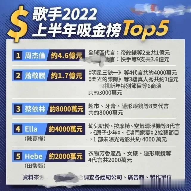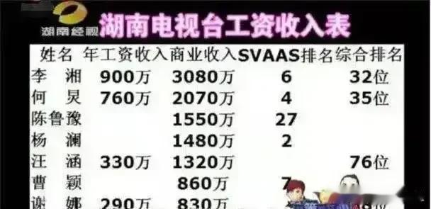 节目中,沈腾问何炅:“你这金牌主持人,年收入得过亿了吧?”面对这么敏感的话题,何炅却毫不避讳地说:“过亿是真没有,不过3000w还是有的。” 不过,这到底是何炅主持一年的收入,还是主持+所有综艺出镜的收入,要知道,何炅本身也是一个导演。 据“2004年福布斯中国名人榜”榜单中何炅收入是1620万元,而如今已经2023年了,收入应该会更上一层楼了。 不过,沈腾本就八卦,问完何炅的工资之后,他又开始问:“那谢娜呢?” 何炅也没有避讳,直言:“娜娜当然比我赚得多,你看到到处都是她的广告。” 如果这样看的话,确实如此,何炅极少代言广告,而谢娜从出道以来就有代言。 但是,大家都不相信,毕竟何炅才是湖南卫视的台柱,何炅也解释,自己只是和湖南卫视签了合同,而谢娜是湖南卫视的直属。 也就是说,谢娜属于湖南卫视的自己人。 不过何炅也说:“我从来不问娜娜的工资有多少,因为这是个人隐私。” 但很久之前,有人放出过这些主持人的工资: 榜首的李湘年薪900w,商业收入高达3000多w。 而第二位就是何炅,年薪760w,商业收入2070w,这个收入水平,一般人也真的是望尘莫及了。 谢娜的年薪大概在300w,但是,她的广告收入比较高,加上各种代言,年收入在4000w左右。 …… 而明星的收入,则主要由以下这几部分组成,分别是表演收入、广告收入、创业收入…… 主持人收入不容小觑,歌手也一样,2022年7月,台媒公布了2022年上半年歌手收入排行榜,周杰伦以1亿元的高收入位居榜首,第二名为萧敬腾,蔡依林排第三。 这些钱真的是我们想都不敢想,怪不得大家都感慨:明星的钱真好赚。 但是说到底我们也只能望洋兴叹,如果想要富有,只有自己努力,找方法、有行动力,不能仅仅停留在脑子的暴富。
