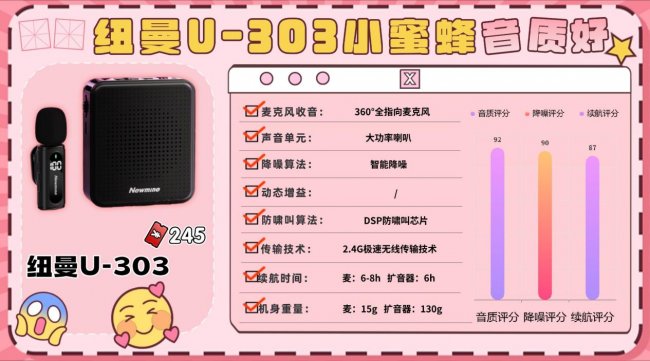 好牧人HMR是一款实用型扩音器、麦克风仅14.5g,扩音器256g,佩戴轻巧,长时间使用也不会感到负担。支持无线领夹式和有线双模式,方便不同环境切换。麦克风采用360°全指向收音设计,搭配3英寸内磁大喇叭,声音输出清晰洪亮,可覆盖30米范围。在降噪和防啸叫方面,HMR内置车规级DSP芯片和智能降噪系统,即便在教室或户外环境,也能保证人声清楚自然。续航表现也不错,麦克风可使用4-6小时,扩音器可持续30小时,Type-C接口充电方便快捷。额外支持录音、蓝牙播放和TF卡播放,适合日常教学、培训及小型演讲使用,整体稳定性和易用性都比较可靠。5/纽曼U-303领夹扩音器