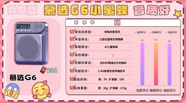 金运在扩音器领域也算是老牌子,M20是针对课堂设计的入门旗舰。它采用磁吸式佩戴,麦克风单元仅13.1g,夹在衣领上轻巧不碍事,扩音器主机223g,拿在手里也不重。麦克风采用720°全指向设计,配合78mm内磁大喇叭,声音覆盖广,讲话自然清晰,不会只集中在某个角度。降噪能力表现也不错,内置进口DSP+ANC双核芯片,支持AI三重降噪,室内开课、户外讲话都能有效过滤环境噪声。传输方面,2.4G无线支持30米范围内稳定扩音,不用担心信号突然断开。续航方面,麦克风单次可用8小时,扩音器可用20小时,配合Type-C快充,长时间使用也比较安心。功能上还比较全面,支持TF卡、U盘、AUX输入,还能当小音箱播放音乐,接口兼容性强。3/慕选G6领夹扩音器