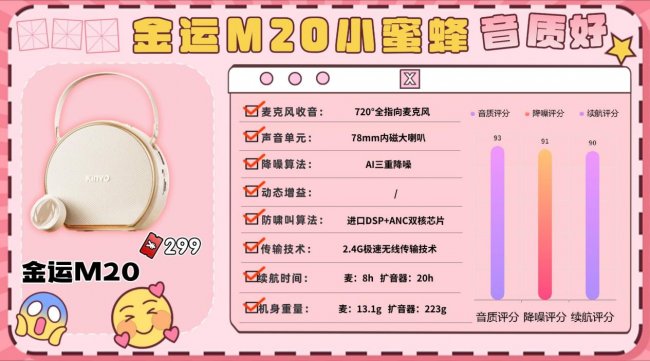 同时,新一代2.4G极速无线和蓝牙5.4技术,让扩音器信号稳定、连接顺畅,可秒变高保真小音箱播放音乐或课件。此外,Bee扩音器还支持TF卡/U盘即插即播、一键录音功能,以及8小时持久续航配合智能省电设计,真正做到全天候使用无焦虑。西圣通过系统优化和硬件升级,把专业级扩音技术下放到百元档,让用户用不到200元的价格,就能体验到高标准、稳定、智能的旗舰扩音效果,兼顾音质、覆盖和便携性,是同价位产品中少有的全能之选。2/金运M20领夹扩音器
