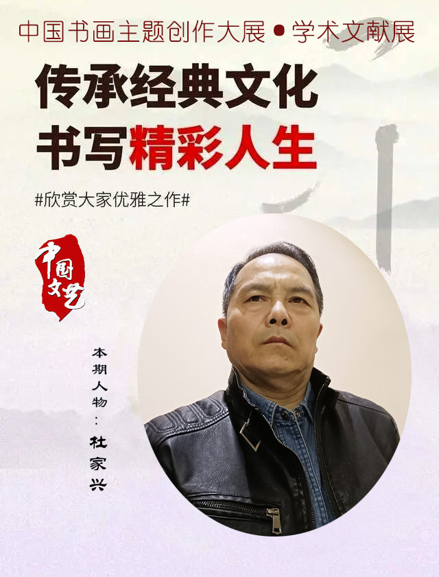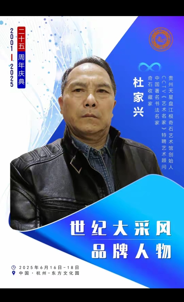 杜家兴,号:西南怪杰,贵州省黔西南州兴义市人士。中国著名根艺艺术巨匠,奇石收藏家,中国艺术名家,中国著名书法名家,国礼艺术名家,中央电视台CCTV《艺术名家》特聘艺术顾问,北京-新加坡《中华文化艺术之旅交流大使》。自小酷爱文学,诗词,书法,摄影。并于2018年8月8日成立了《贵州天星盘江根奇石艺术馆》,《西南杜氏书体书法艺术室》,《西南摄影艺术摄影艺术室》。书法艺术室三类书法体:一类直线形自创书体,《注:首创于2020年春》,二类行书体,三类草书体。并在2021年“九州诗词杯”全国诗词大赛荣获优秀奖,2022年文韵传承《中国现代名家书画大赛》荣获书法二等奖,2023年“新春墨韵杯”全国书画艺术大赛荣获书法一等奖,2023年第28届全国书画家“兰亭杯”书画大赛荣获书法银奖,2023年荣获“诸子百家杯”全国文学大赛三等奖。本艺术馆书法作品还在2023年有幸参加《贵州汉台酒业有限公司》“国宴国酒-艺术茅台”酒文化,书法作品荣登《艺术珍藏酒》瓶。又于2024年再次荣幸参加《贵州汉台酒业有限公司》举办的“艺术茅台-祥龙呈瑞”2024新春贺岁,书法作品再次荣登美酒瓶。还于2024年参加江西景德镇陶瓷艺术宣传中心主办“景瓷天下-传承国粹”活动。本馆根艺,书法作品荣登艺术陶瓷。并于2023年荣幸参加澳门邮政“盛世中华-复兴有您”《纪念毛泽东同志诞辰130周年》,根艺,书法作品荣登澳门邮票出版收藏册为两会献礼。又于2024年本馆根艺,书法作品再次荣幸参加澳门邮政邮票出版收藏册为“建国伟业-庆祝中华人民共和国75周年”献礼。又再于2025年根艺,书法作品荣登:中国抗日战争暨世界反法西斯战争胜利80周年纪念,全球《北京-新加坡》中华文化艺术之旅活动!纪念邮册邮票出版。另外在2024年本馆根艺,书法作品受邀走出国门…荣登大洋彼岸的美国纽约时代广场数字大屏幕及:2025年马来西亚吉隆坡双子塔数字大屏幕展播。还于2025年受邀代表中国艺术界出席杭州第25届世纪大彩风品牌人物年度盛典并发言。2025年艺术馆作品受邀参加由新加坡政府出版《世界非遗传承人大辞典》。2025年受邀参加“庆祝故宫博物院建院100周年”,根艺,书法作品荣幸登上由:比利时,德国,荷兰,日本,韩国五大国邮政集团负责印制并全球发行。2025年受邀法国巴黎《第36届卢浮宫当代国际艺术博览会》及《丝路艺韵》2025中俄艺术之旅暨圣彼得堡美术家协会特邀展…本馆书法作品荣幸参展。书法作品【麗人沙滩賞景舞樂】被俄罗斯【圣彼得堡美术协会国际艺术收藏】。2025年,还被授予“国之瑰宝大红袍艺术家”称号,为国礼大红袍代言。其作品以融合传统与现代艺术风格著称,多次作为国礼参与国际文化交流。