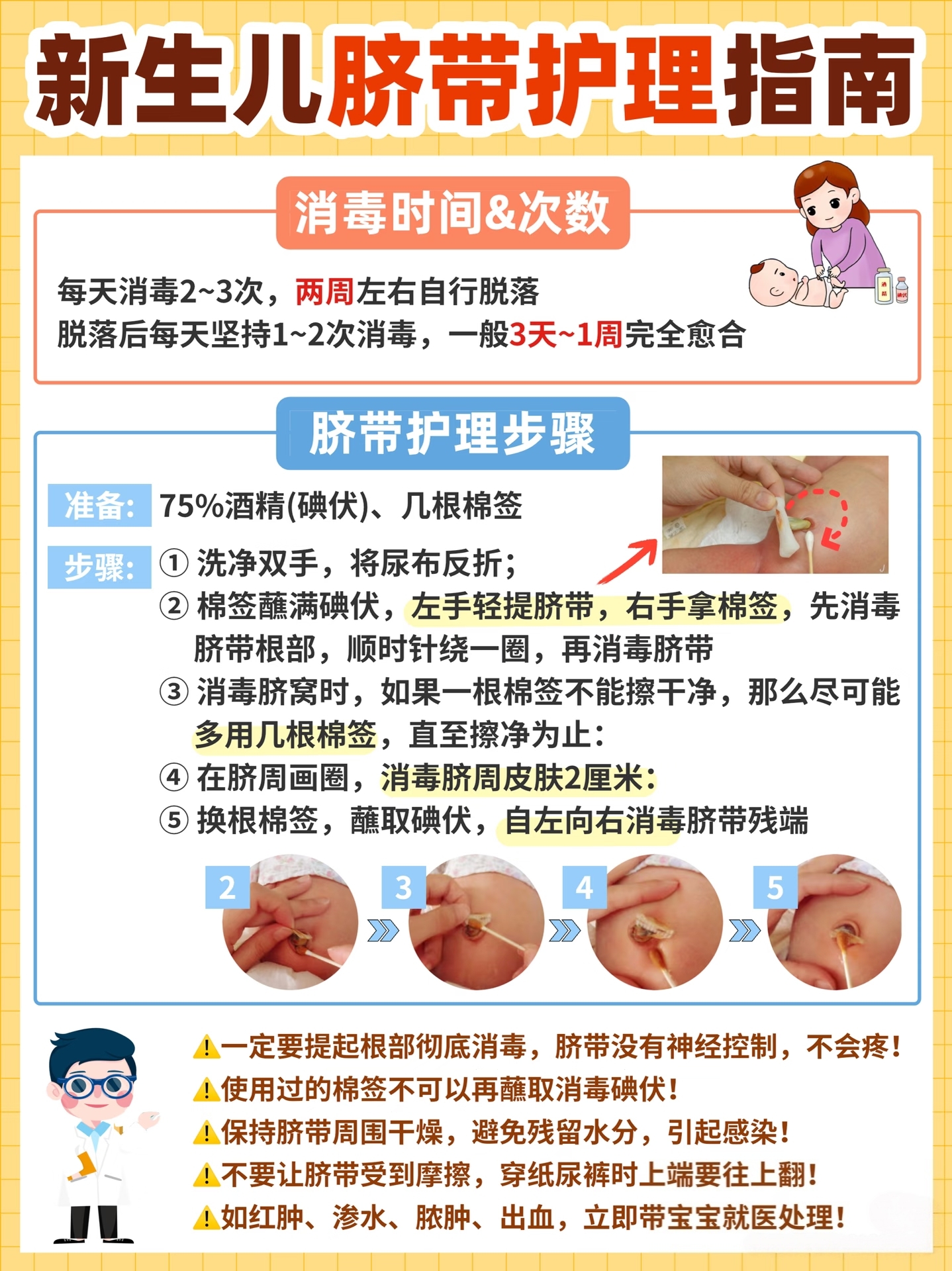 清——用碘伏棉签,一定要提起脐带根部,从里向外转圈擦。光擦表面没用,根部才容易藏污纳垢。一般15天左右自行脱落,别手痒去拽。