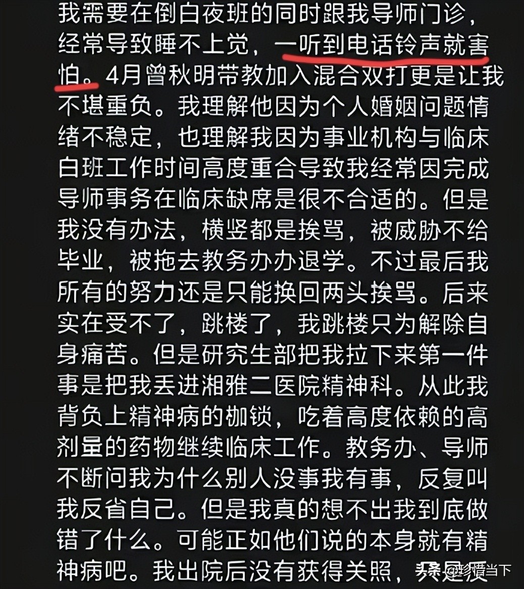但最让人心寒、也是最令人细思极恐的细节来了:孙同学曾经因为痛苦不堪,尝试过轻生但未遂。按照常理,这时候学校和老师是不是该赶紧心理干预、好好安抚?并没有!她被导师和学院直接送进了精神病院。