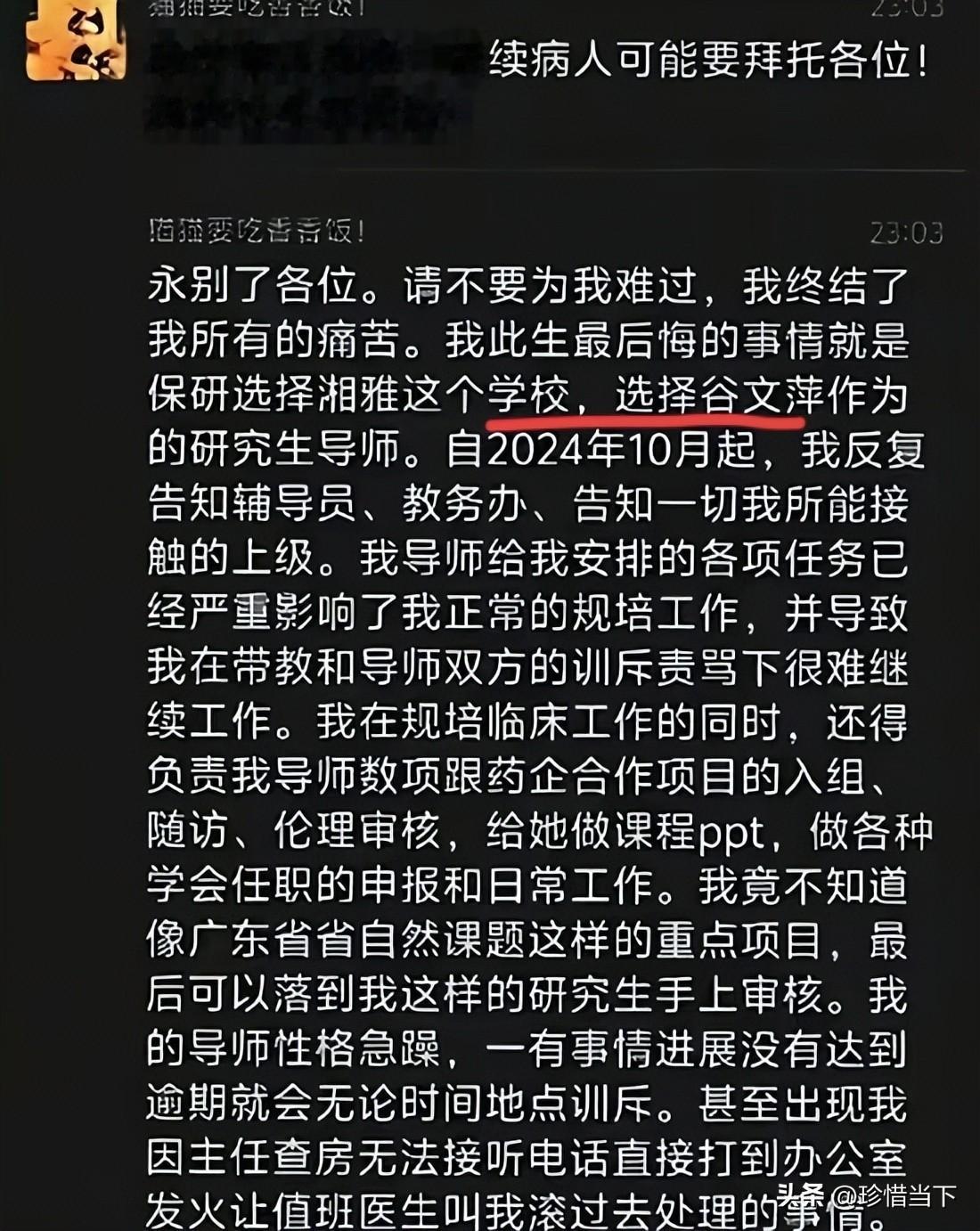 信里的内容,读起来让人窒息。孙同学说,她的导师谷某,长期对她进行精神上的“围剿”。这哪是严师出高徒啊,这分明是赤裸裸的职场PUA。你想想,白天她在科室规培,累得像个停不下来的陀螺;晚上还得做实验、写论文,甚至要处理导师安排的大量私人杂务——取快递、接孩子、办私事,仿佛她不是个研究生,而是个随叫随到的“高级保姆”。